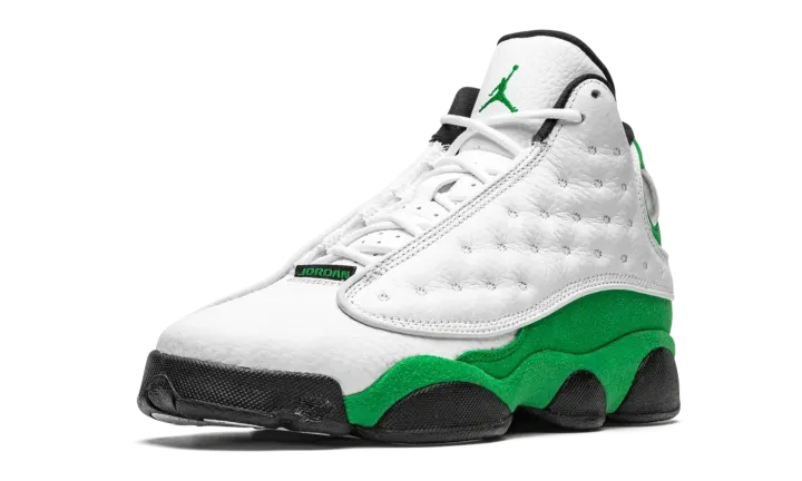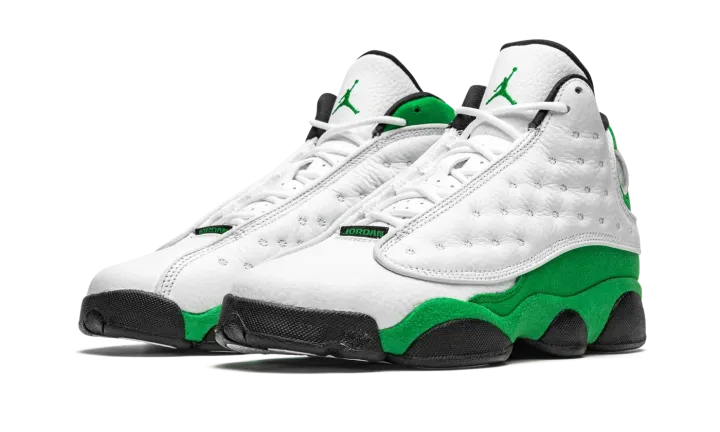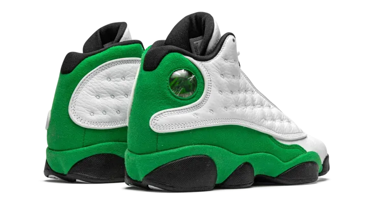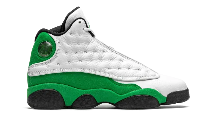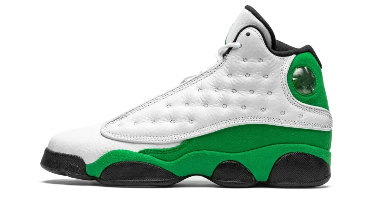The Air Jordan 13 GS "Lucky Green" is the youth sizing of Michael Jordan's thirteen signature shoe in a Boston Celtics inspired colorway. A play on this shoe being the thirteenth model in the Air Jordan series, the "Lucky Green," as it is appropriately nicknamed, is also similar to Ray Allen's player exclusive colorway from his days with the Celtics. A white dotted leather panel appears on either side of the upper. The toe features white tumbled leather. A green embroidered Jumpman resides on the top of the perforated white leather tongue. Lucky Green suede is located on the heel as well as on the mudguard. A holographic emblem meant to resemble the eye of a panther resides near the collar. Black midsole walls, and a black nylon tag with "JORDAN" written in green lettering finish off the look of the Air Jordan 13 "Lucky Green" in grade school sizing.