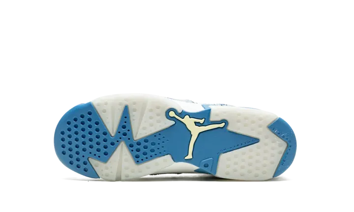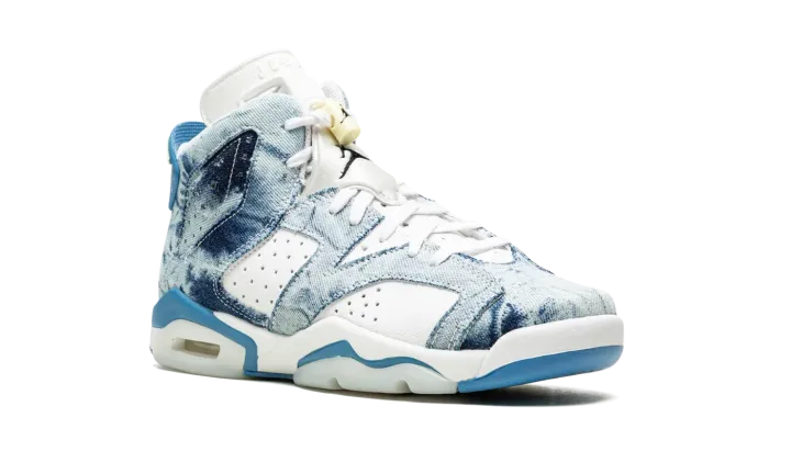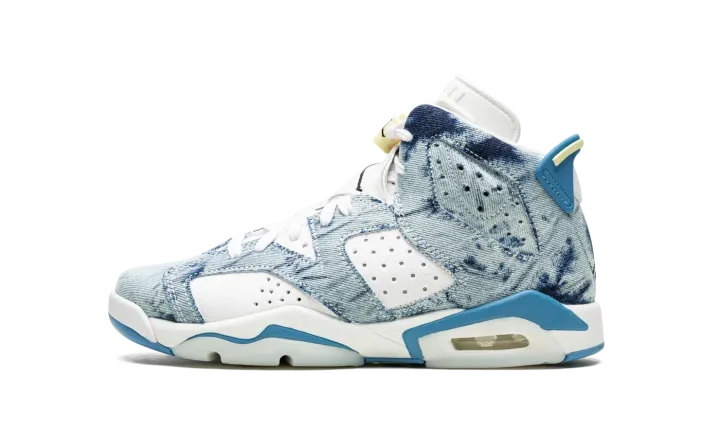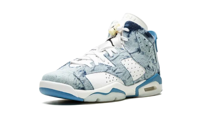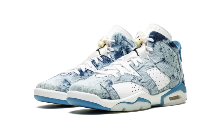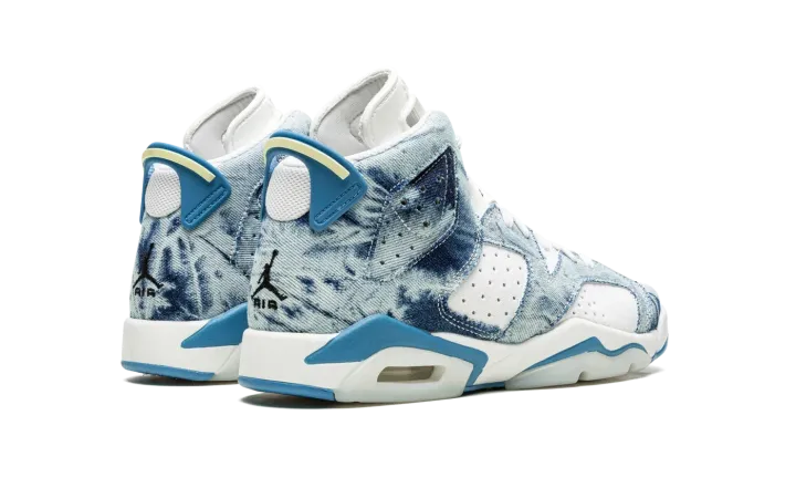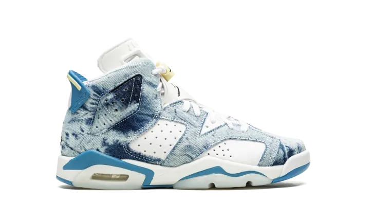 The Air Jordan 6 GS "Washed Denim" is kid's-exclusive colorway of Michael Jordan's sixth signature shoe with a trippy, acid wash denim on its design. The "Washed Denim" Jordan 6 GS features a white leather base with colorful contrasting washed denim overlay panels. A black Jumpman logo is embroidered on the heel above classic "Air" branding. An additional black embroidered Jumpman is found on the white neoprene lace overlay. Lime Green accents the rear heel spoiler. The visible Air unit in the heel is bordered by light blue paneling, which completes the look. Release date: May 15, 2022