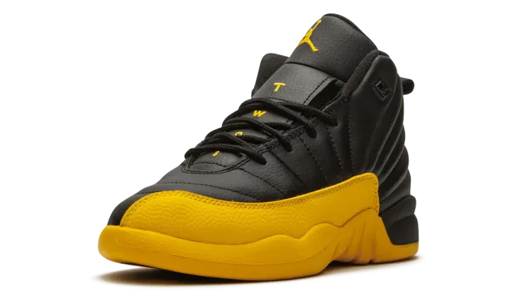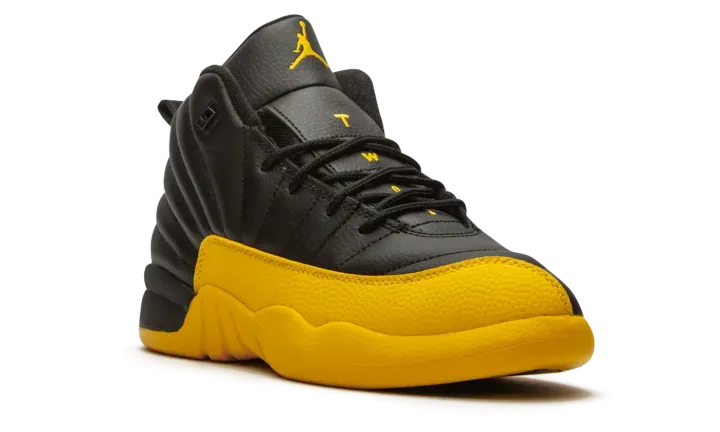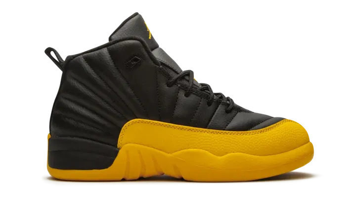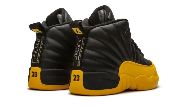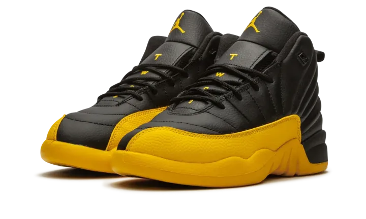 The Air Jordan 12 PS "University Gold" is the preschool sizing of Michael Jordan's signature shoe in a fresh color scheme that arrived for summer 2020. Jordan Brand employs the familiar two-tone appearance of some of the greatest Jordan 12s to craft the "University Gold" colorway. The upper features premium black leather with a contrasting lizard-patterned leather mudguard. Understated styling bits, like the black laces, silver hardware, and black leather tongue allow for embroidered yellow Jumpman and "Two 3" branding on the tongue to attract attention. Release date: July 18, 2020.