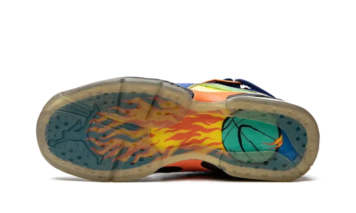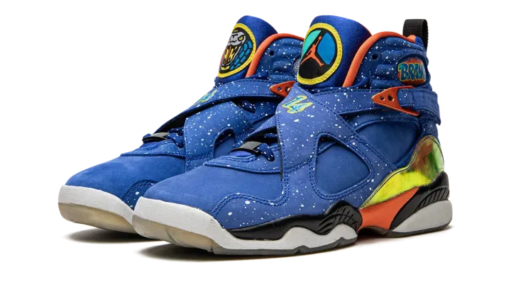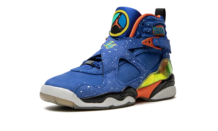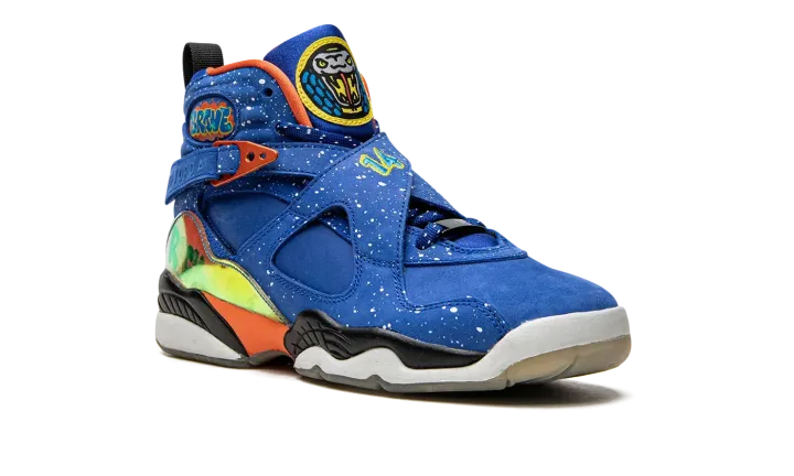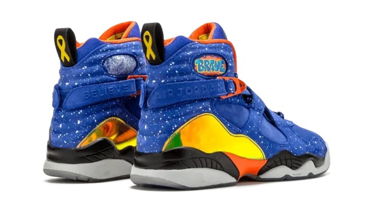 Part of the always-celebrated Nike Doernbecher Freestyle Collection, this Air Jordan 8 from the 2014 set features one of the most memorable looks of the shoe ever. The bold colorway by patient Caden Lampert features a speckled Hyper Blue upper with iridescent graphic mudguards and a flaming basketball graphic under the clear outsole. This listing is for Grade School sizing only.