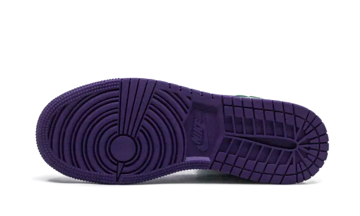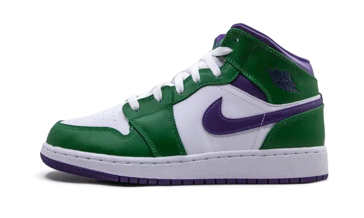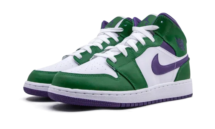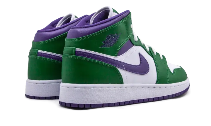 The Air Jordan 1 Mid "Hulk" is the grade-school version of the adult silhouette inspired by the Marvel monster known as The Incredible Hulk. Employing a color scheme that represents the destructive character, the white leather upper features vibrant green leather overlays covering the forefoot, collar, and heel. A clean white leather base appears on the mid-panel and perforated toe. Purple accenting covers the Nike Swoosh, as well as the padded collar. Purple Wings detailing on the collar and Jumpman branding on the green nylon tongue tab complete the look.