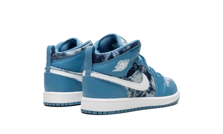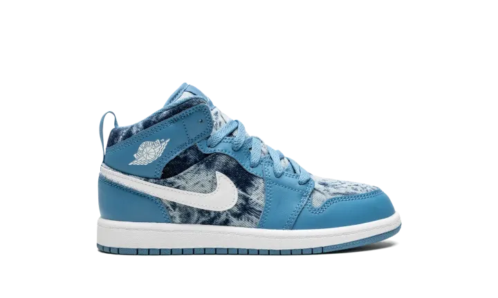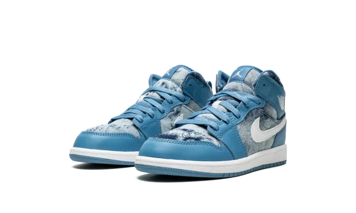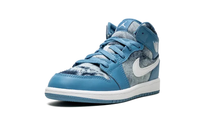 The Air Jordan 1 Mid GS "Washed Denim" is the children's sizing of the Jordan 1 Mid in a bold denim colorway. This sneaker abandons the usual leather base for a stonewashed denim pattern. Denim is featured on the upper with University Blue leather overlays throughout the sneaker. The Swoosh, Wings logo on the ankle panel, and Jumpman on the tongue tag add contrast in white, which is also displayed on the rubber midsole underfoot. A pull tab is added to the sneaker on the heel for easy access for kids. A blue outsole completes the fun Jordan 1 Mid for kids Release date: February 1, 2022