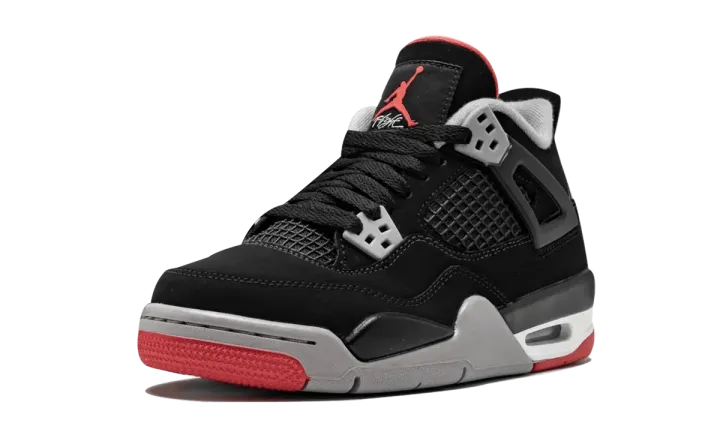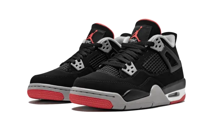 The Air Jordan 4 "Bred" GS is the grade school children's sizing for the 2019 retro of the iconic colorway of Michael Jordan's fourth signature shoe. The kids' "Bred" Jordan 4 features the same classic construction and color scheme as the adult version, including the original Nike Air branding on the heel tab. The shoe features a Durabuck (synthetic nubuck) upper in black with red, grey, and white accents throughout to mirror the Chicago Bulls color scheme. In addition to the large Nike Air logo on the heel tab, the original Nike branding is also present on the outsole and sockliner. The Air Jordan 4 GS "Bred" released on May 4, 2019.