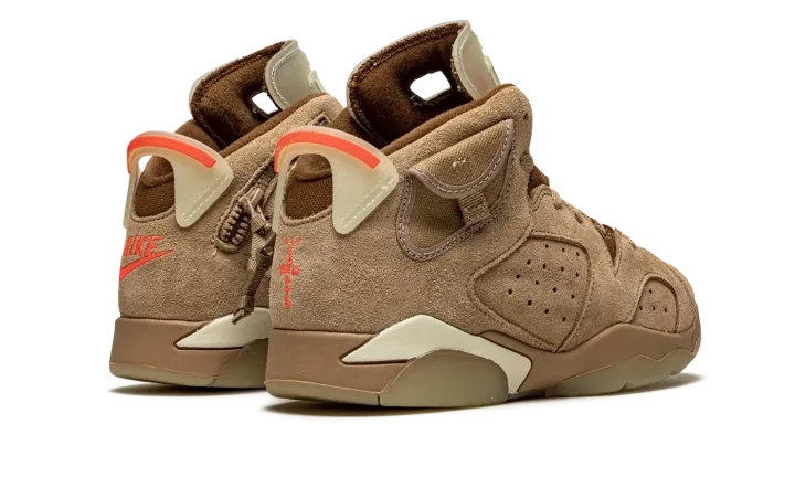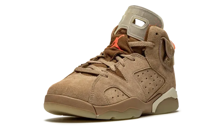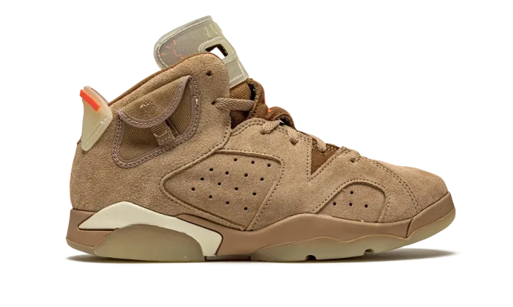 The Travis Scott x Air Jordan 6 PS "British Khaki" is the preschool sizing of the hip-hop star's second edition of Michael Jordan's sixth signature shoe. From Spring 2021, Travis Scott's extremely hyped Jordan 6 "British Khaki" succeeds the military inspired "Cactus Jack" colorway produced by Scott and Jordan Brand in 2019. The upper on the "British Khaki" features a monochromatic brown suede construction. An orange embroidered Jumpman is embroidered onto the dark brown canvas tongue. Like Scott's first Jordan 6 design, the "British Khaki" dons an added stash pouch on the collar, a utilitarian design meant to mimic the kinds of pockets that can be found on the side of cargo pants and military gear. A zip pocket appears on the lateral side of the collar and provides the wearer with additional storage. Embroidered Nike and "Cactus Jack" branding can be found on the back of the left and right shoe, respectively. Finishing touches include a light brown mudguard and a glow-in-the-dark translucent outsole.