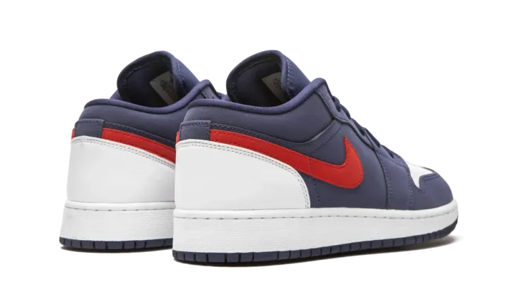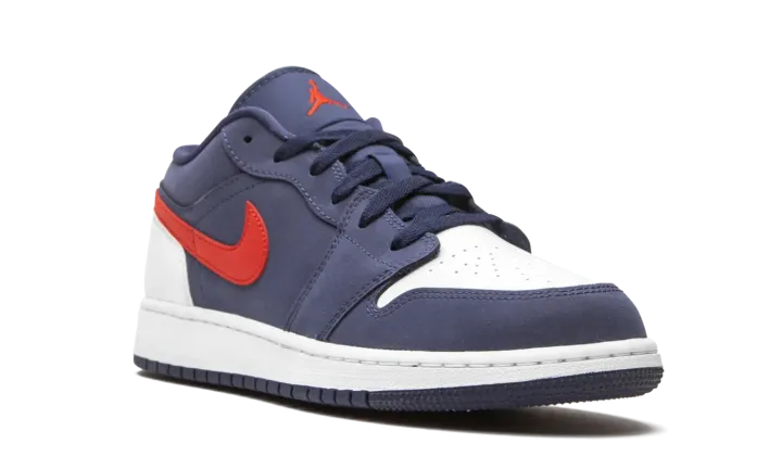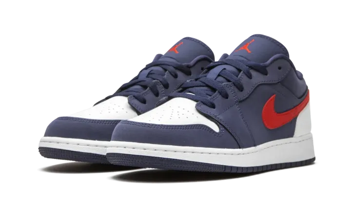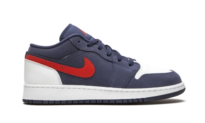 The Air Jordan 1 Low GS "USA" is the youth sizing of Michael Jordan's first signature shoe in low-top form dressed in a patriotic colorway. Slimmed down in size to fit the feet of children, this "USA" design proudly displays the colors of the American flag. The upper features Midnight Navy nubuck on the forefoot, mid-panel, and collar. Smooth white leather appears on the perforated toe and heel to balance the look. Elsewhere, a University Red leather Swoosh dots the mid-panel, and a mini red Jumpman is embroidered onto the navy blue nylon tongue. Tonal shoelaces, a white rubber midsole, and blue outsole complete the look of this clean Jordan 1 Low in grade school sizing.