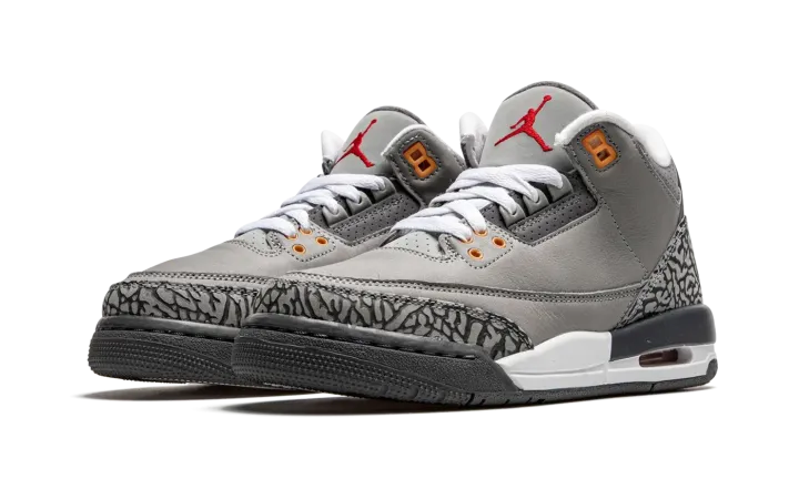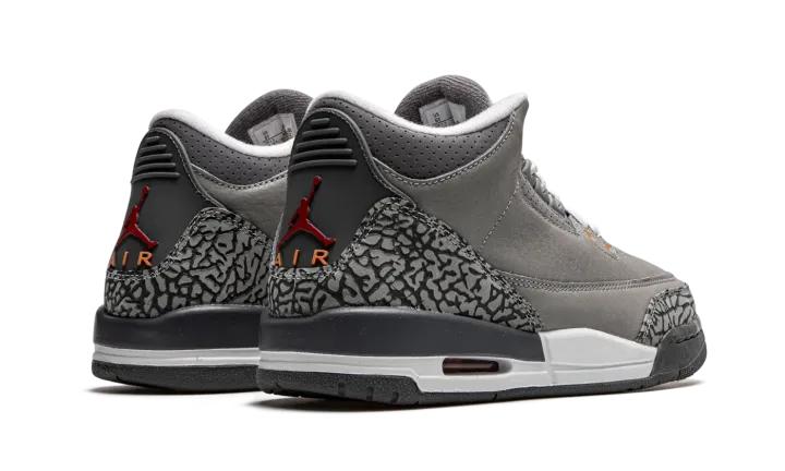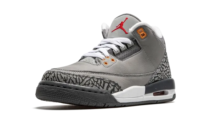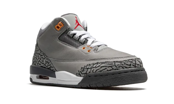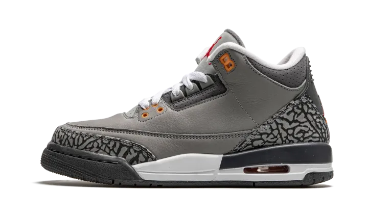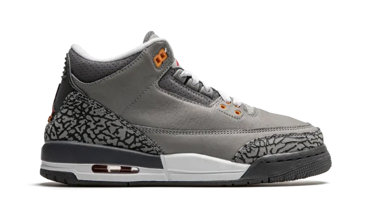 Embrace a timeless favorite with the Air Jordan 3 Retro GS "Cool Grey." This Grade School-sized sneaker is a highly anticipated reissue of the popular 2007 colorway. It features a sleek Cool Grey leather upper accented by the signature elephant print overlays in a matching tonal shade. Subtle but vibrant pops of Orange Peel and Sport Red on the molded eyelets and Jumpman branding break up the neutrals. With visible Air cushioning, this shoe delivers both legendary style and supreme comfort.