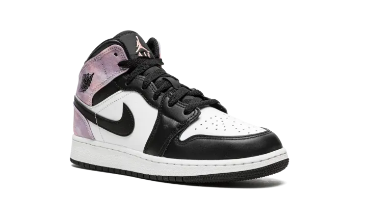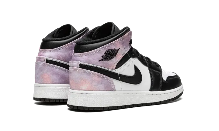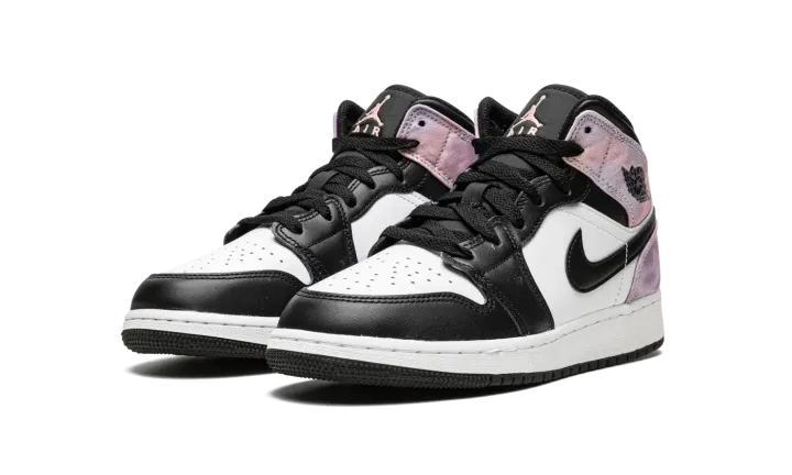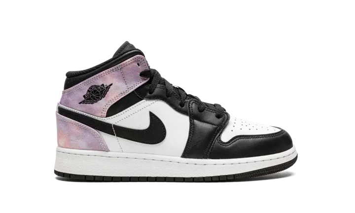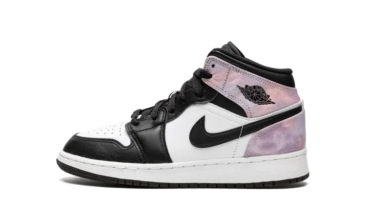 The Air Jordan 1 Mid GS SE "Tie-Dye" is a kids-exclusive makeup of the mid-top version of Michael Jordan's first signature shoe that features tie-dye detailing on its design. New for Spring 2022, the "Tie-Dye" is yet another versatile Jordan 1 Mid colorway for kids. Details include a white leather base with contrasting black leather overlays. A black leather Swoosh is located on the mid-panel and a black "Wings" logo is found on the collar. Both the collar overlay and the heel panel are featured in a purple-pink tie-dye design that vibes effortlessly with the easy going style of summer clothes and footwear.