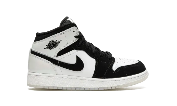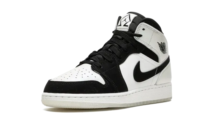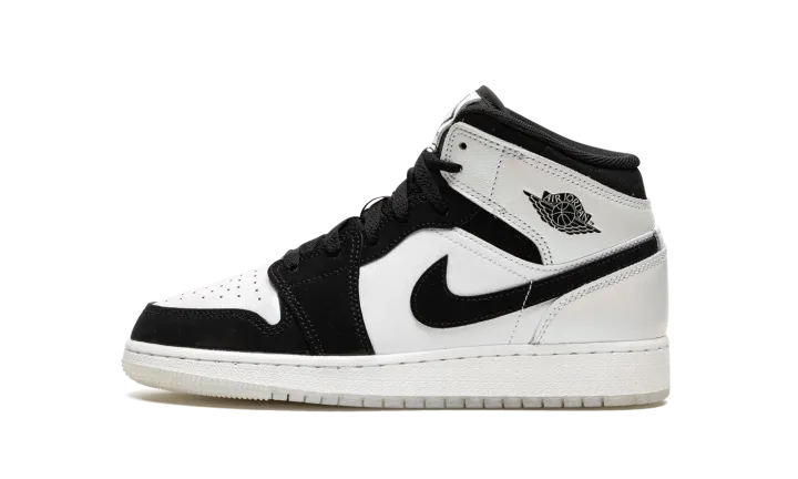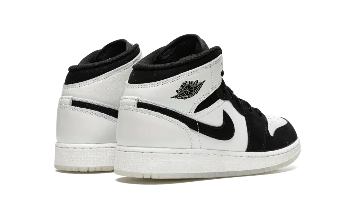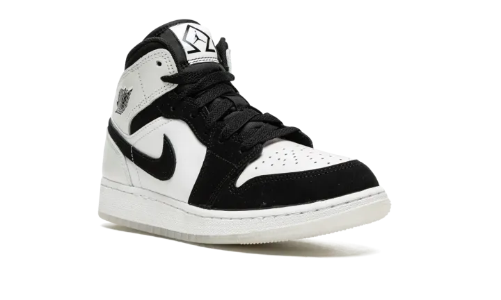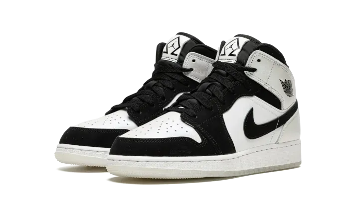The Air Jordan 1 Mid GS "Diamond Shorts" is the youth sizing of the colorway inspired by Air Jordan diamond basketball shorts. In addition to appearing on the Jordan 1 Mid, the "Diamond" style also appeared on the Jordan 1 Low. As for this shoe, it features a black synthetic nubuck toe cap, forefoot, eyelets, mid-panel, and collar. The perforated toe, mid-panel, collar, and heel are designed in white leather. A black "Wings" logo is embroidered on the back of the shoe. The unique "diamond" logo found on the tongue tag mimics the design of the same detailing found on the sides of Jordan Brand's mesh basketball shorts, which are inspired by classic Chicago Bulls shorts. A white rubber midsole and milky translucent outsole complete the look.