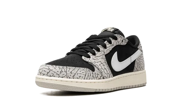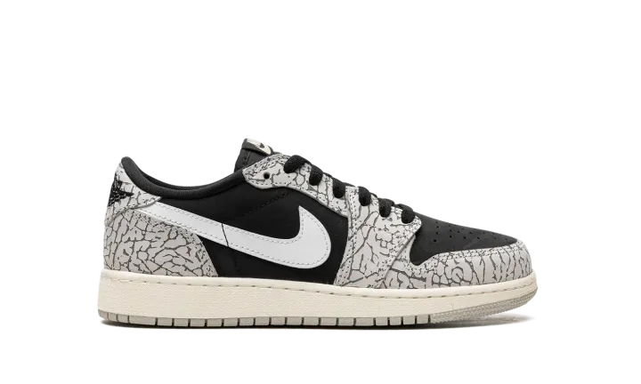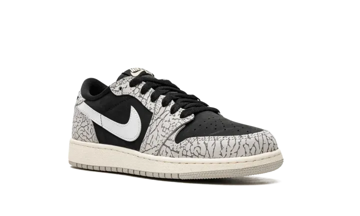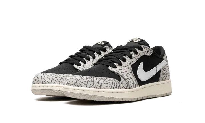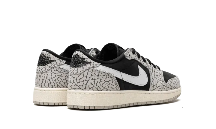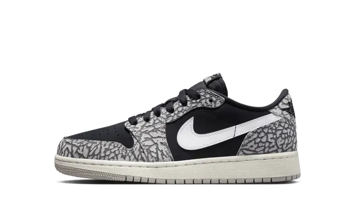 The Air Jordan 1 Low OG GS "Elephant Print" is the youth sizing of the vintage basketball shoe that incorporates a classic patterning of the Air Jordan 3. From Jordan Brand's "Elephant" collection, the "Elephant Print" Jordan 1 Low OG nods to the Air Jordan 3 by featuring its iconic elephant pattern across the upper. The shoe's base is designed in black leather. A white leather Swoosh is found on either side. Classic "Wings" and "Nike Air" logos appear on the heel and tongue tag, respectively. Release date: June 23, 2023