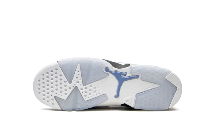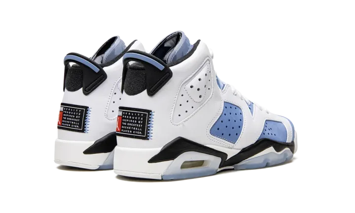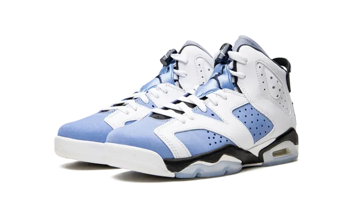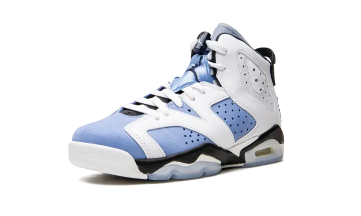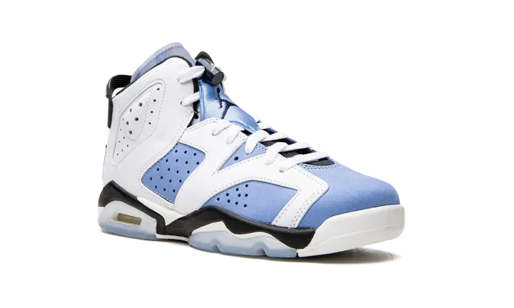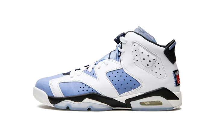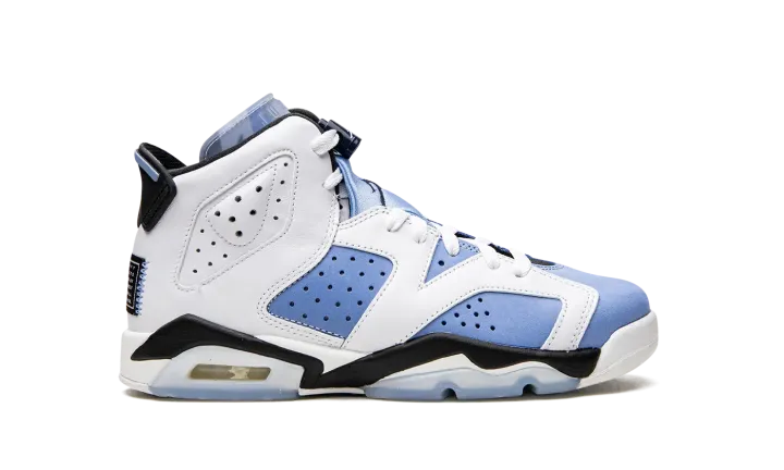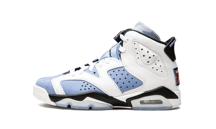 The Air Jordan 6 GS "UNC" is the youth sizing of the collegiate-inspired colorway of Michael Jordan's retro basketball shoe that nods to Jordan's alma mater. From March 2022, the Jordan 6 GS "UNC" is yet another colorway from Jordan's signature shoe collection that employs the team uniform colors of the North Carolina Tar Heels on its design, and it doesn't disappoint. The "UNC" mirrors the color block of the Jordan 6's original "Carmine" colorway from 1991. The University Blue synthetic nubuck base gives way to contrasting white leather overlays on the shoe's upper. The neoprene lace overlay that is complete with black Jumpman branding is designed in University Blue, as well. Additional baby blue accenting appears on the spoiler on the back of the shoe and on the tongue. An embroidered "Team Jordan" patch on the heel is inspired by product tags found on the bottom of basketball jerseys. Release date: March 5, 2022