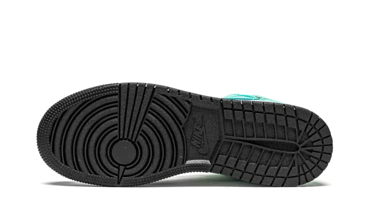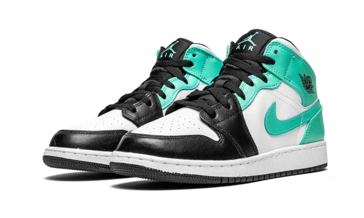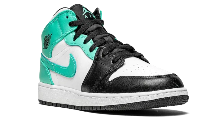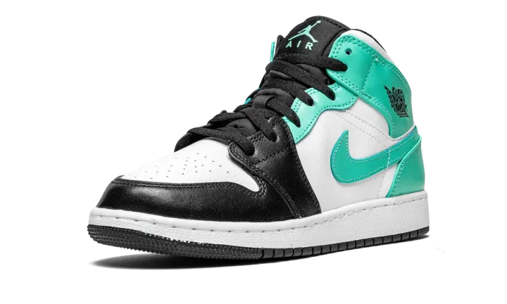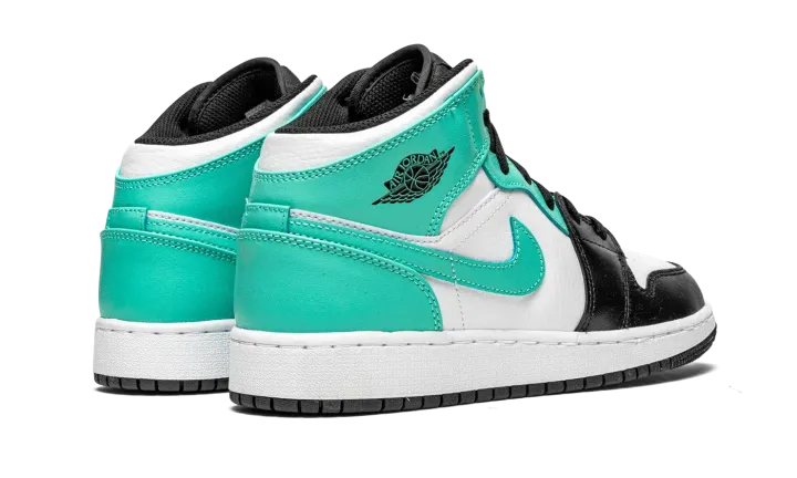 The Air Jordan 1 Mid GS "Tropical Twist" is a summer-ready look of the iconic retro basketball shoe for kids. In mid-top form, Michael Jordan's first signature shoe ranks as one of the most sought after footwear styles on the market thanks to its ties to the legendary basketball player and its comfort and timeless design. On the "Tropical Twist," Jordan Brand pairs bright Tropical Twist leather overlays with a crisp white leather base. The white-and-black, two-tone look of the white perforated toe and black forefoot and eyelets mimics the color block of the Jordan 1's original "Black Toe" colorway. A teal leather Swoosh can be found on either side and a black "Wings" graphic is located on the Tropical Twist leather overlay on the collar. Additional Tropical Twist detailing highlights the look of the Jumpman and "Air" detailing printed on the black nylon tongue tag.