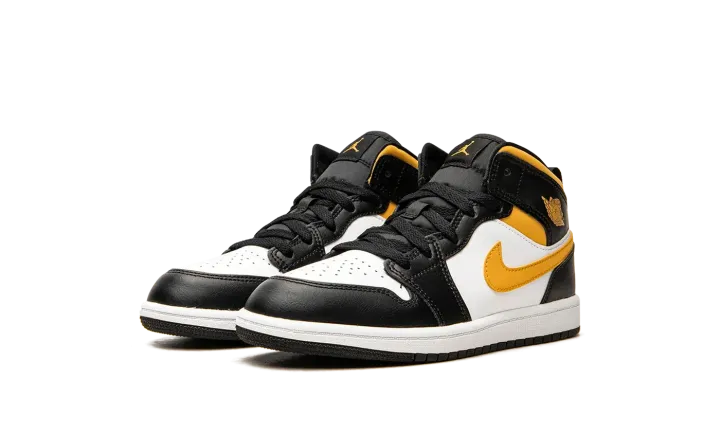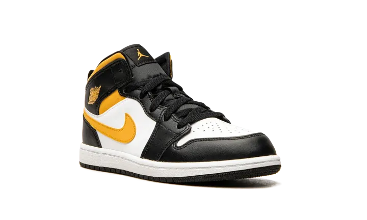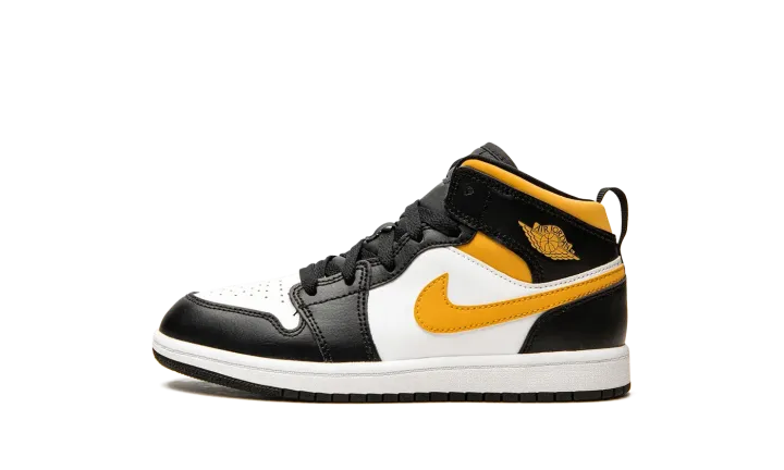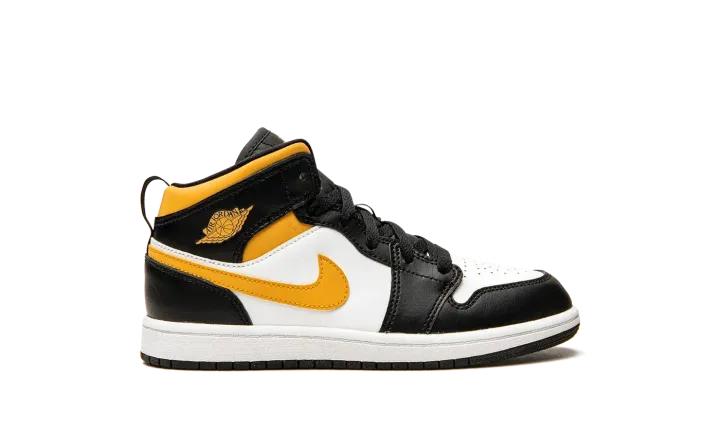The Jordan 1 Mid PS "White/Pollen/Black" is the preschool version of the mid-top lifestyle shoe in a clean, wearable colorway. The Air Jordan 1 Mid is the alternate version of Michael Jordan's first signature shoe, and one of Jordan Brand's most popular shoes. Here, on the "Pollen," white leather appears on the toe and mid-panel. Contrasting black leather panels and a Pollen-colored Swoosh on either side of the shoe balance out the look of the neutral base. Additional details include a yellow "Wings" logo on the collar and a yellow Swoosh on the tongue, and a pull tab on the heel that assists with easy on/off wearability. A two-tone, white midsole and black rubber outsole brings the look together.