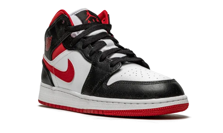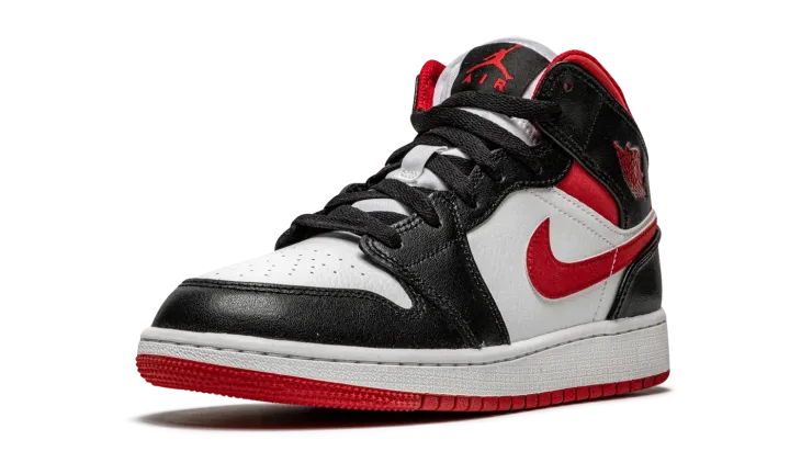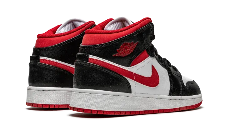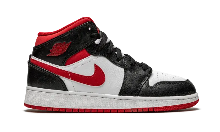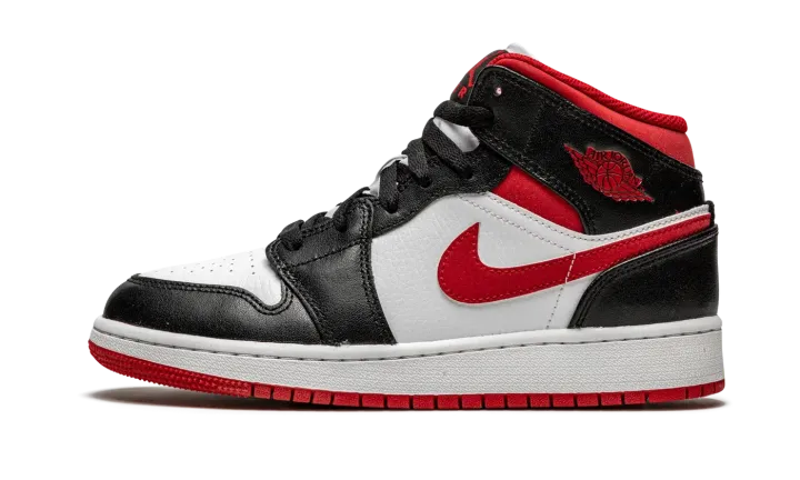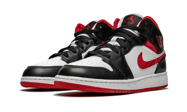 The Air Jordan 1 Mid GS "Metallic Red" is a Chicago Bulls influenced makeup of Michael Jordan's first signature shoe for kids. Drawing inspiration from the Bulls' team uniform colors, black, white, and red, the "Metallic Red" is yet another appealing look for the legendary former basketball and current lifestyle silhouette. Here, Jordan Brand places white leather on the perforated toe and on the mid-panel. Black leather appears on the forefoot, eyelets, collar, and heel. A matte Metallic Red material graces the Swoosh and ankle panels, while the "Wings" logo also receives the metallic red finish. The modern metallic red hue is slightly "flatter" in shine than that of the metallic red used on the original Air Jordan 1 "Metallic Red" from 1985. A red Jumpman and "Air" branding appear on the black tongue tag stitched onto the white nylon tongue.