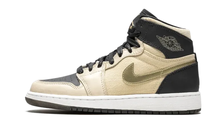 The Air Jordan 1 Retro Hi Premium HC "Heiress" is a girls' sneaker that has the perfect combination of crisp tailoring and sport-inspired style. The elevated aesthetic comes from the use of subtly different materials like matte, tumbled, and iridescent leather and a distressed canvas at the midfoot. The translucent rubber sole underneath throws in another distinct feature for good measure. Pearl white and black create much of the color scheme, with metallic gold detailing on the Nike Swoosh and subsequent Jordan branding.