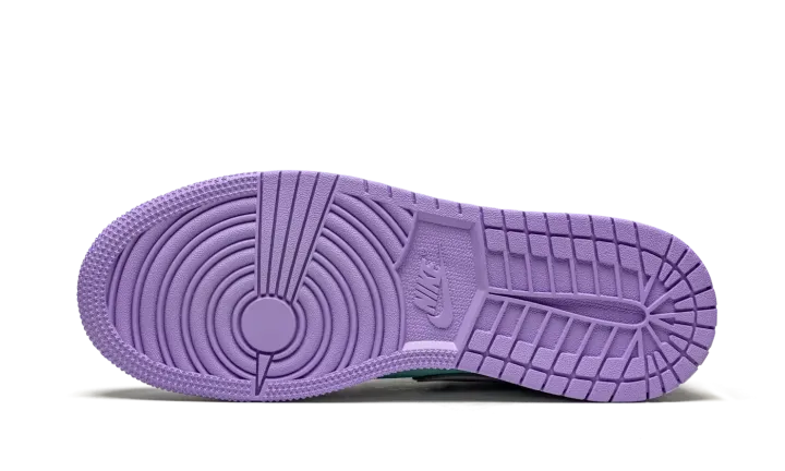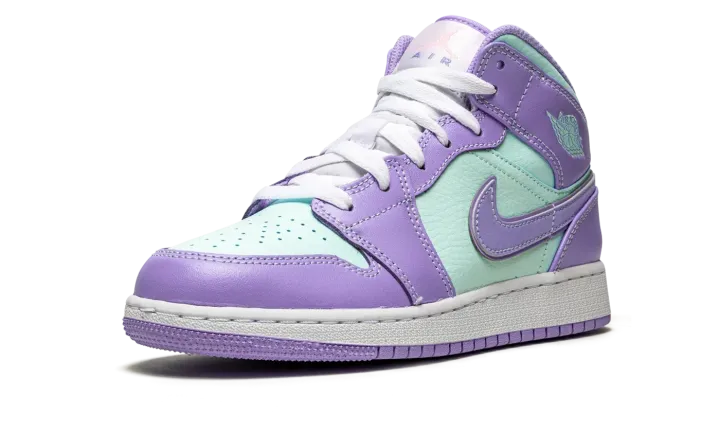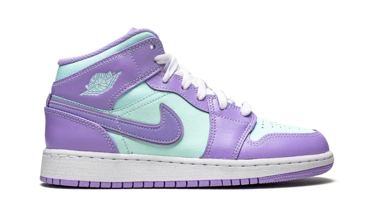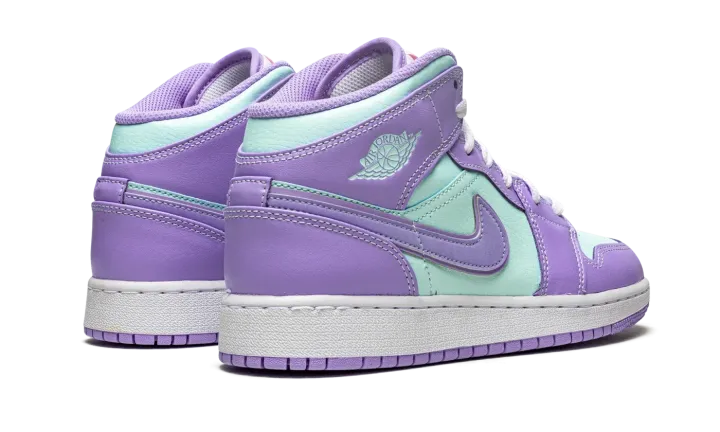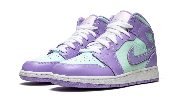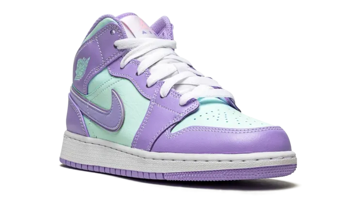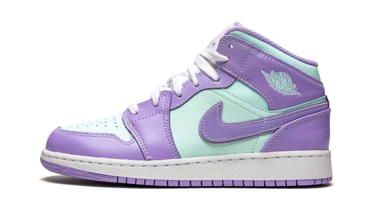 The Air Jordan 1 Mid GS "Purple Pulse/Arctic Punch" is a youth version of Michael Jordan's first signature shoe in an Easter inspired colorway. The "Purple Pulse/Arctic Punch" references the pastel colors associated with the springtime holiday on its design, employing purple leather detailing on the forefoot, eyelets, collar, heel, and Swoosh. A light aqua leather base contrasts the look. Jordan Brand places an Arctic Punch "Wings" logo on the collar and a pink Jumpman on the tongue tag. A white nylon tongue, white shoe laces, and purple mesh sock liner add to the calming colorway. The white midsole and contrasting purple outsole complete the look of this head-turning Air Jordan 1 Mid for kids.