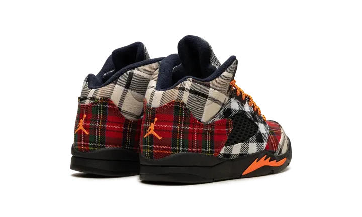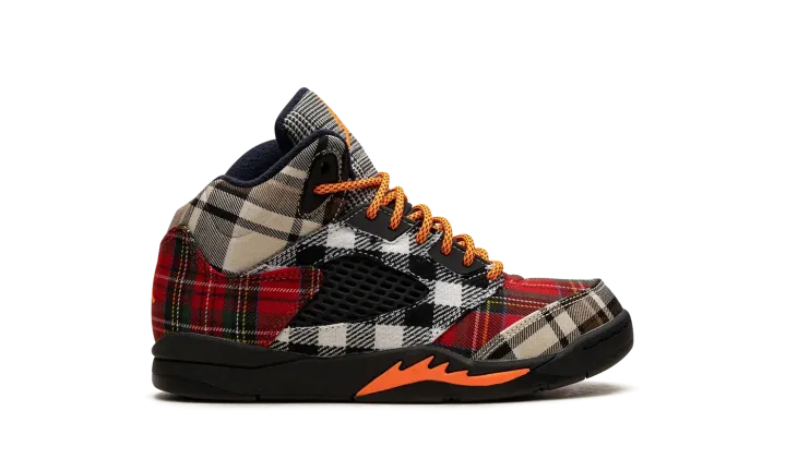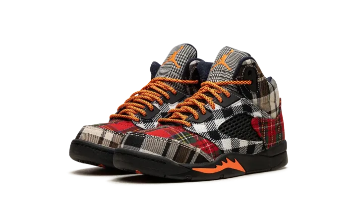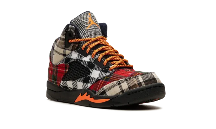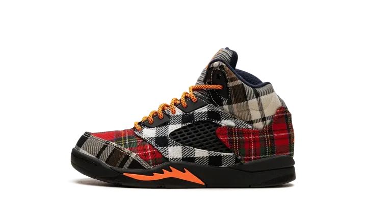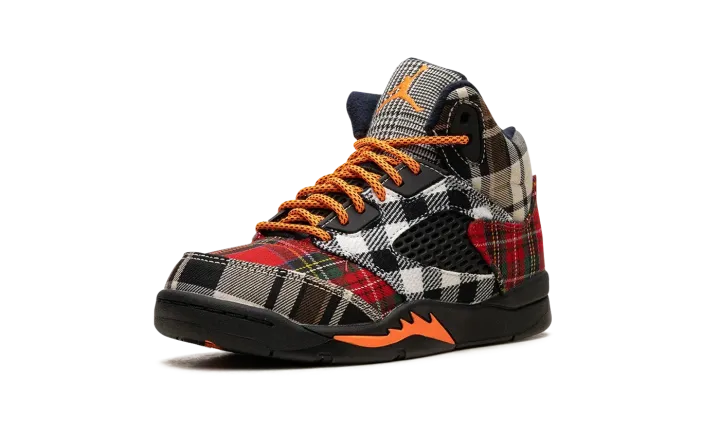 The Air Jordan 5 PS "Plaid" is the preschool sizing of Michael Jordan's fifth signature in a fun colorway with various plaid patterns on its design. This unique-looking Jordan 5 colorway features multiple plaids in different color patterns on its upper. As for the rest of the shoe, a black mesh netting is seen on either side and on the tongue. Total Orange-colored speckled rope laces and an orange Jumpman appear on the tongue. Additional orange accenting can be found on the Jordan 5's signature shark tooth detailing on the forefoot. Release date: October 20, 2023