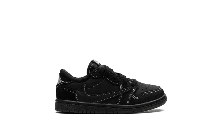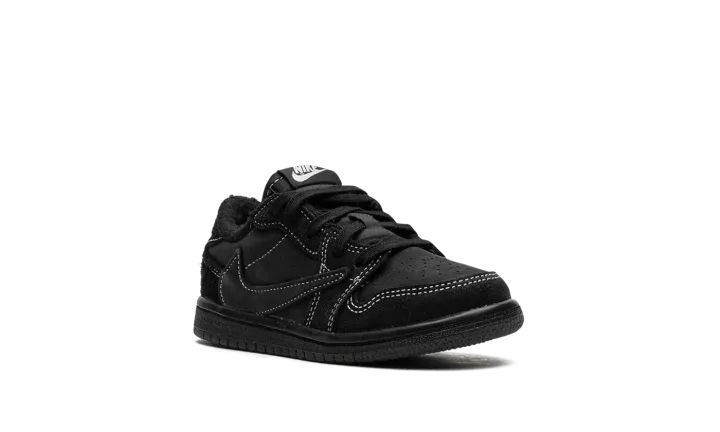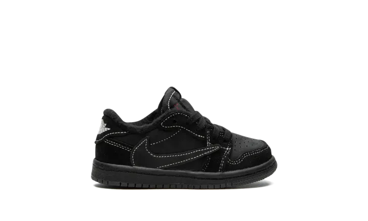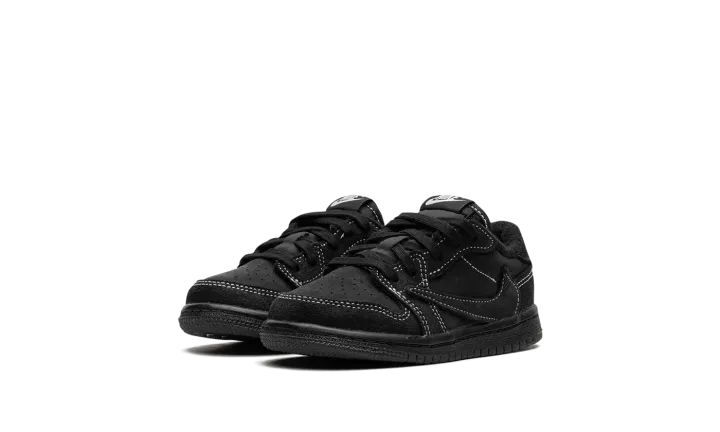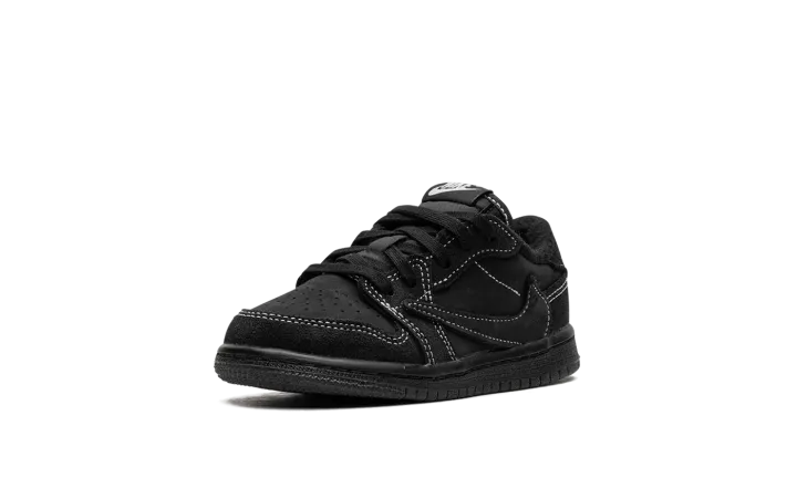 The Travis Scott x Air Jordan 1 Low OG TD "Black Phantom" is the toddler sizing of the limited edition collaboration by the hip-hop star for a mostly monochromatic black colorway of Michael Jordan's first signature shoe. The "Black Phantom" continues the Houston native's collaborative run of Air Jordan 1s in a big, albeit somewhat unexpected way, by applying a versatile, mostly black design to the popular sneaker. The shoe's black nubuck upper is paired with tonal suede overlays that feature white contrast stitching. Travis's signature reverse Swoosh logo is found on the lateral side of the shoe with white contrast stitching, while a standard Swoosh appears on the medial side. Mismatched heel tabs featuring a "Wings" logo on the right shoe and an embroidered bee design on the left shoe add another layer of intrigue to the design. Release date: December 15, 2022