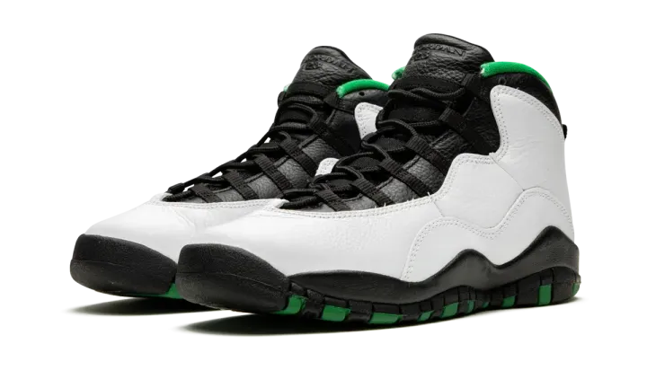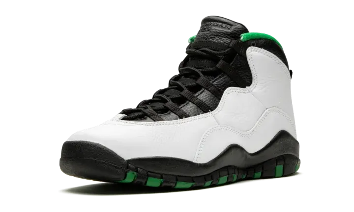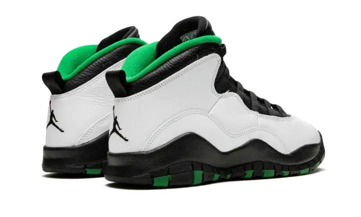 The Air Jordan 10 GS "Seattle" is the youth sizing of a classic original colorway inspired by the now-defunct Seattle Supersonics basketball team as part of the Jordan 10 "City Pack." Kendall Gill, then a shooting guard for the Sonics in 1994, wore the "Seattle" makeup on-court as part of Nike's effort to "pass the torch" of Michael Jordan's signature line onto some of the NBA's rising stars while he was off playing minor league baseball. A white tumbled leather functions as the base of the upper and is contrasted by soft black leather around the eyelets and collar. Jordan Brand brings back the original styling of the Air Jordan 10 "Seattle" with a green liner that features the size of the shoe on the inner wall. An embroidered black Jumpman on the heel and green accenting on the outsole are true-to-original design elements. The Air Jordan 10 GS "Seattle" in grade school sizing was released on October 19, 2019.