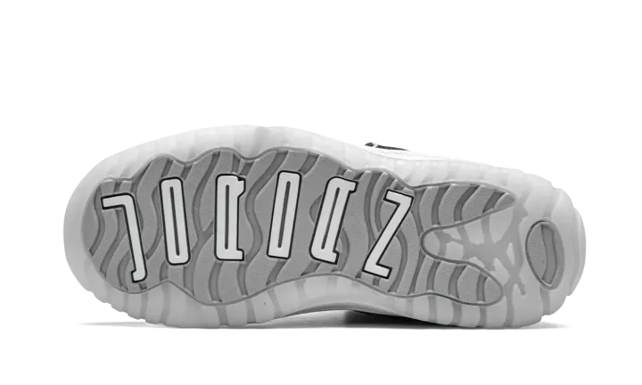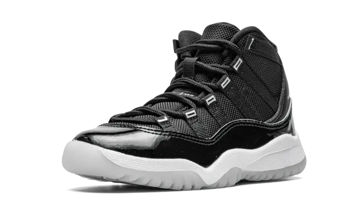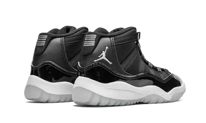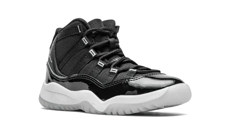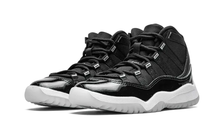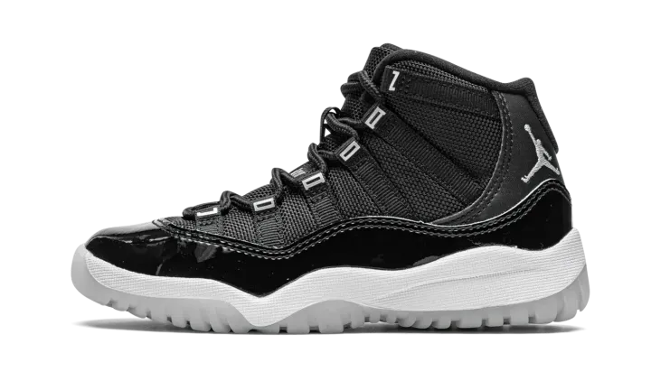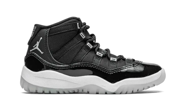 The Air Jordan 11 PS "Jubilee" is the preschool sizing of Michael Jordan's eleventh signature shoe in a special colorway that honors the model's 25-year anniversary. Released by Jordan Brand in December 2020, the "Jubilee" references an original sketch by Tinker Hatfield during his design process in the 1990s. The word "Jordan" is spelled out in silver text along the side of the eyelets in reference to an original concept created by Hatfield. A silver Jumpman emblem appears on the collar in the same premium finish as the "Jordan" detailing. Elsewhere, a black patent leather mudguard above the white midsole salutes the "Concord," "Space Jam," and "Bred" colorways. Release date: December 12, 2020.