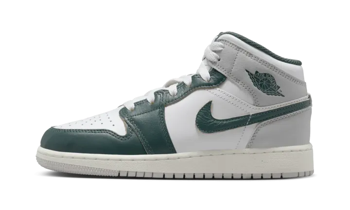 Re-discover a favorite with the Jordan 1 Mid SE GS, the effortlessly fresh "Oxidized Green" colorway designed for grade schoolers. Inspired by the '85 original, this mid-top features an upper crafted from premium real and synthetic leather in crisp white, Neutral Grey, and a bold pop of Oxidized Green. An encapsulated Nike Air unit in the midsole delivers supportive, lightweight cushioning, ensuring total comfort. This sneaker perfectly blends iconic heritage with a clean, contemporary color palette.