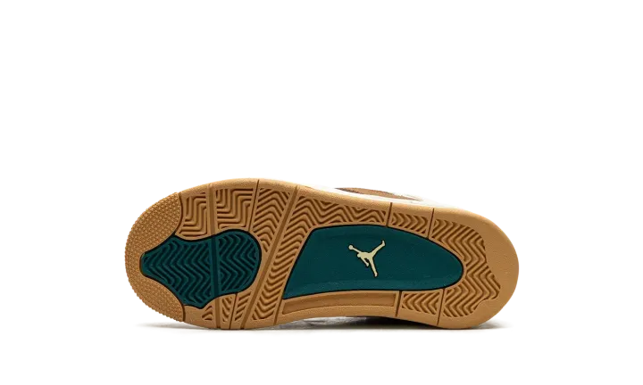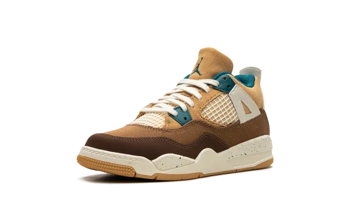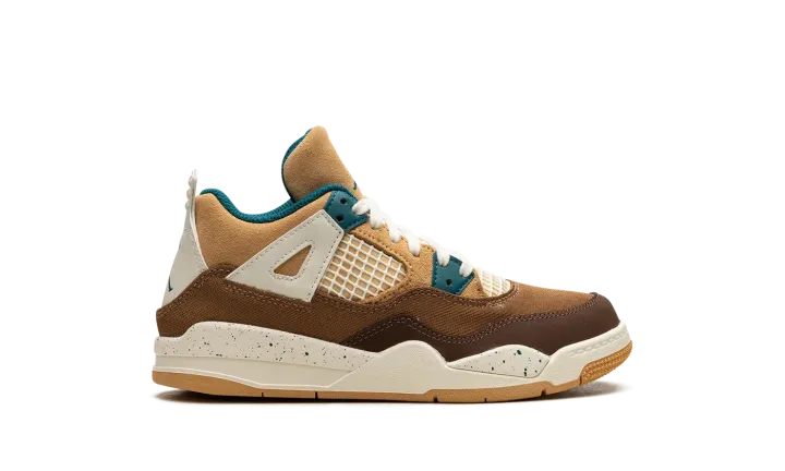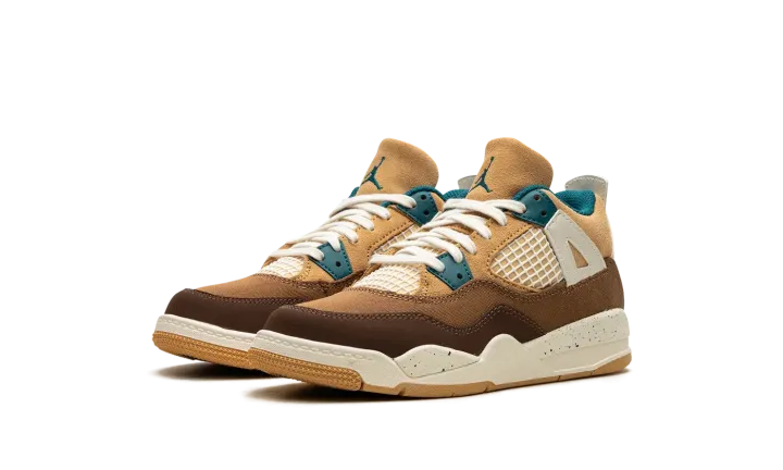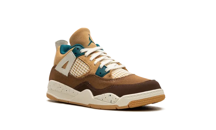 The Air Jordan 4 Retro PS "Seasonal Collector" is the preschool sizing of the colorway inspired by children playing outside and the great outdoors. The "Seasonal Collector" features an array of materials and neutral colors on its design, with shades of brown and tan appearing on the upper. White netting is seen on the tongue and on the mid-panel. Geode Teal accenting can be found on the eyelets, as well as on the speckling seen on the white laces, the Jumpman on the tongue and on the heel, and the inner lining. Underfoot, the shoe's white midsole features blue speckling.