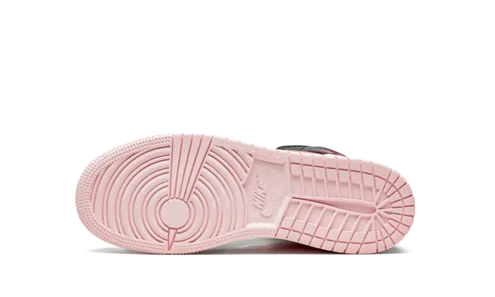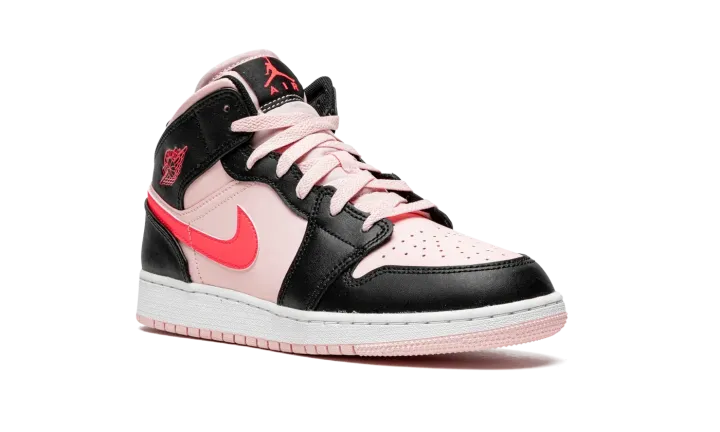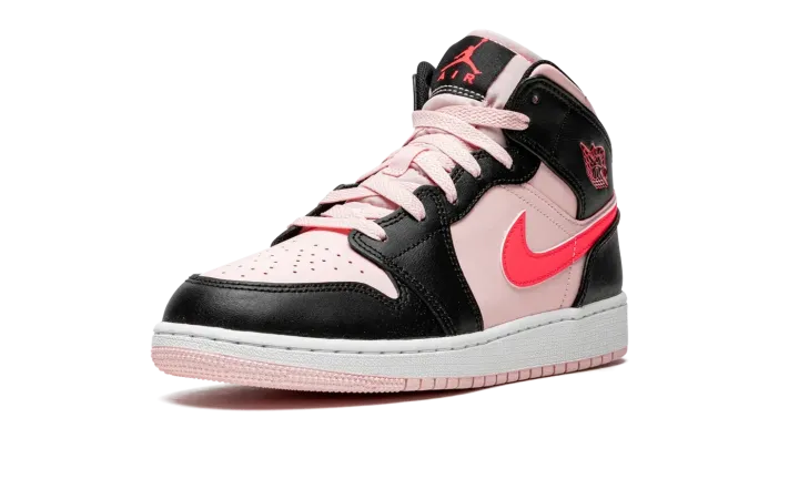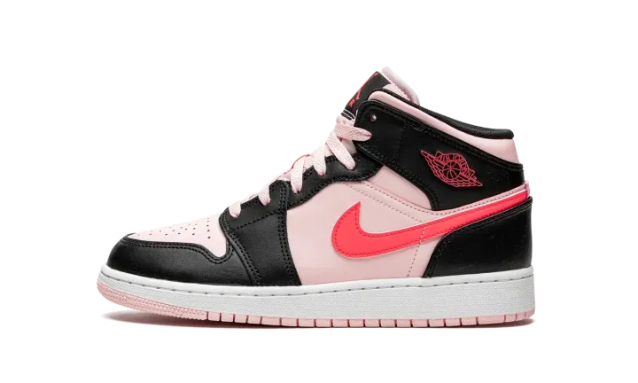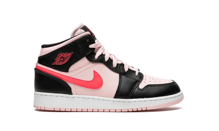 The Air Jordan 1 Mid GS "Atmosphere/Infrared" is a youth-sized version of the mid-top lifestyle shoe in a fun, head-turning colorway. The Jordan 1 Mid for kids in "Atmosphere/Infrared" has a light pink leather base with contrasting black overlays on the forefoot, eyelets, collar, and heel. A neon pink leather Swoosh appears on either side of the shoe and pink "Wings" branding can be found on the collar overlay. Additional pink accenting comes into play on the Jumpman and "Air" branding located on the black tongue tag. Both the laces and nylon tongue are designed in light pink. A two-tone, white midsole and pink outsole finish off the look.