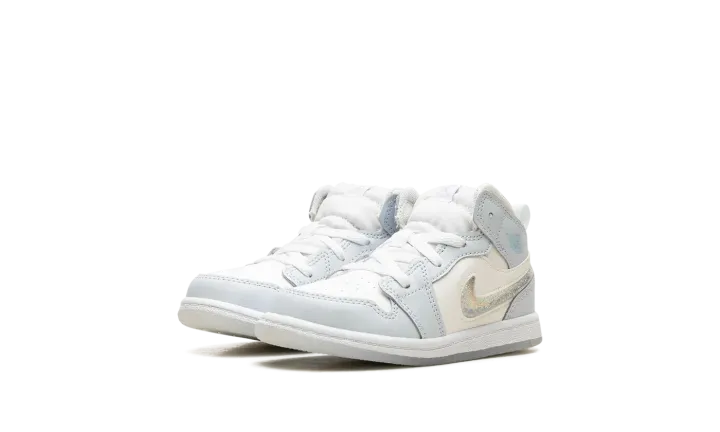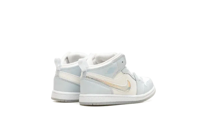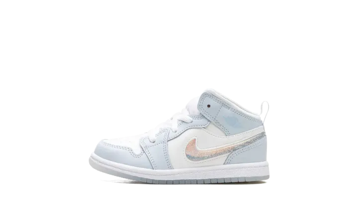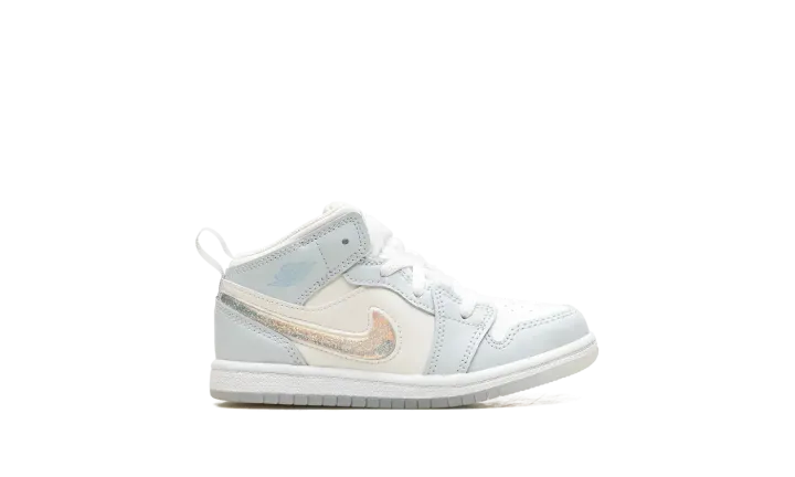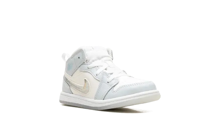 The Air Jordan 1 Mid TD "Glitter Swoosh" is the toddler sizing of the lifestyle sneaker with a winter-inspired design. The upper is complete with a Summit White leather construction with Blue Tint leather overlays. The Swoosh on the lateral side is constructed in clear plastic with glitter that can move around inside it for a unique and fun look inspired by snow globes. A light blue "Wings" logo can be found on the collar, while a Jumpman appears on the tongue tag. Underfoot, a white midsole and icy translucent outsole complete the winter theme. Release date: November 27, 2023