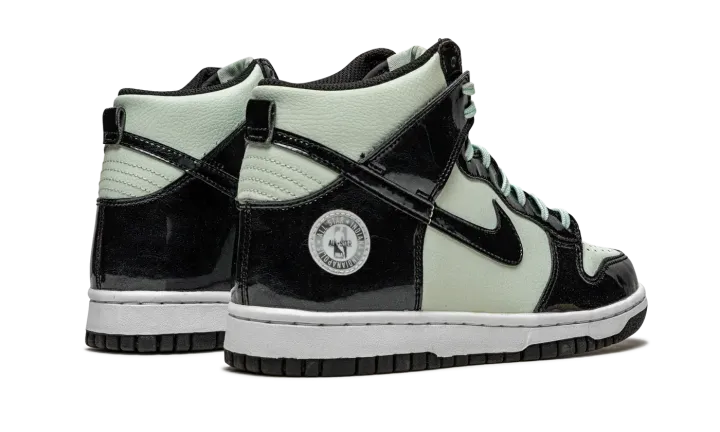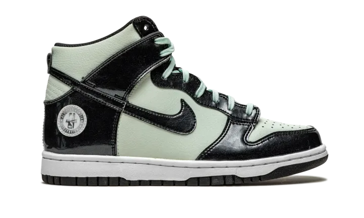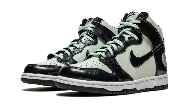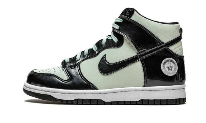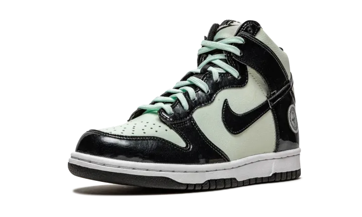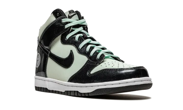 The Nike Dunk High GS "All-Star 2021" is the youth sizing of the colorway that was released in March 2021 in celebration of the 2021 NBA All-Star Game. Released next to an Air Jordan 1 Mid of the same nickname, the "All-Star 2021" Dunk High displays a premium aesthetic with glossy, wavy-textured detailing on its glossy black panels and Swoosh branding. A minty green leather base adds an appealing high-contrast look to the lifestyle shoe. Nike adds a small NBA All-Star design to the heel. The circular patch actually references Indiana, the location in which the 2021 NBA All-Star Game was scheduled to take place before the COVID pandemic altered the NBA's plans. The laces and tongue's branding tag also feature the Barely Green hue. Release date: March 9, 2021.