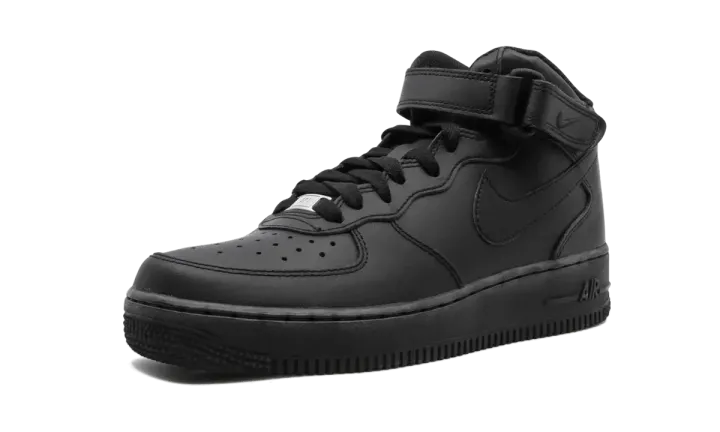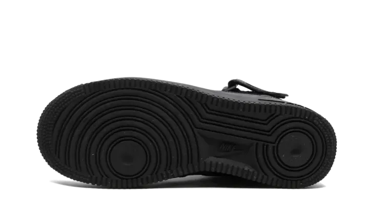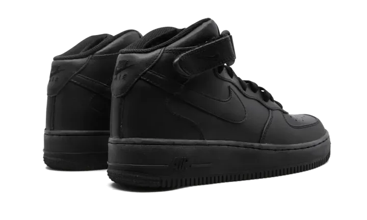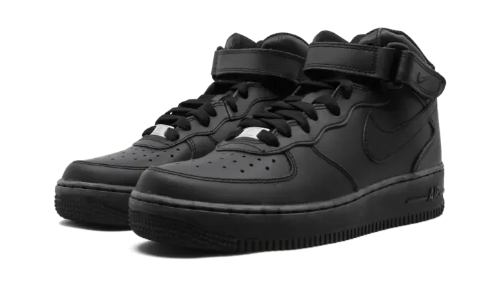 The Nike Air Force 1 Mid GS "Triple Black" is the youth sizing of Nike's iconic Air Force 1 in versatile mid-top form. Complete with a all-black-everything colorway, this kids' Air Force 1 Mid features styling components such as a tonal leather Swoosh on the mid-panel, "Nike Air" embroidery on the heel, and an adjustable ankle strap for total lockdown support. Black leather forms the base of the shoe, appearing along the perforated toe, mid-panel, and heel. Black cotton laces, a silver "AF1" lace tag, and a chunky black rubber sole round out this all-time classic shoe.