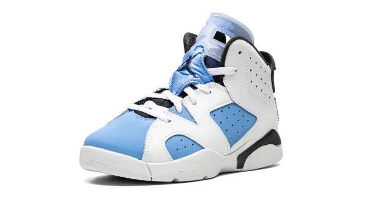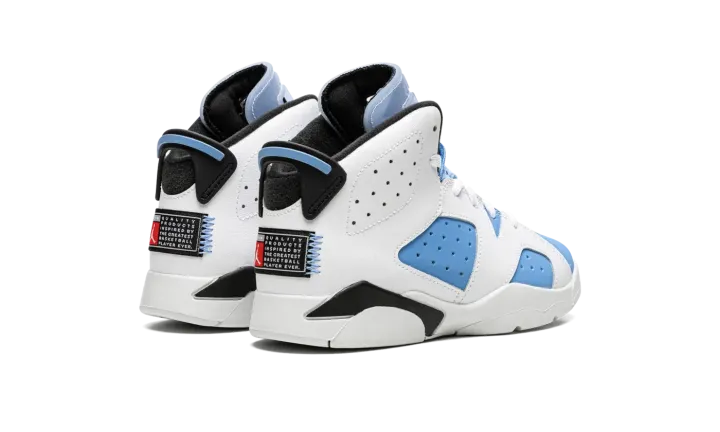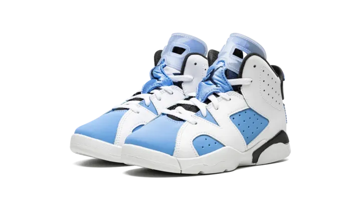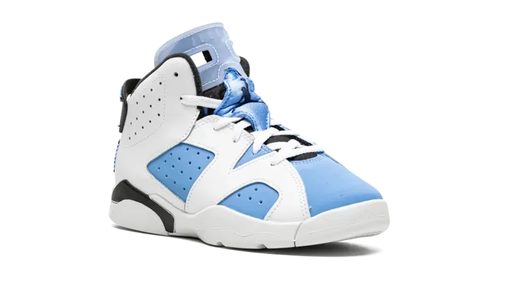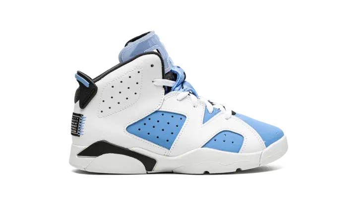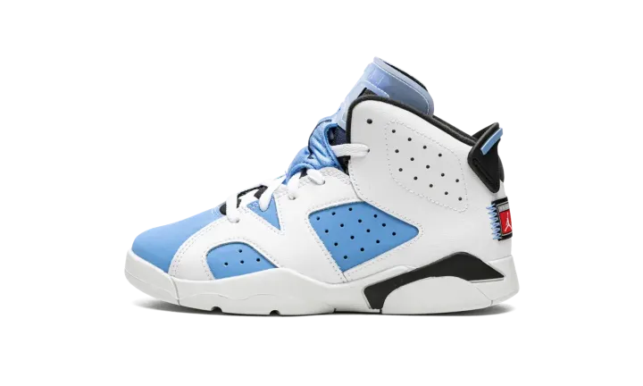 The Jordan 6 TD "UNC" is the toddler sizing of Michael Jordan's sixth signature shoe in a colorway that celebrates his alma mater, the North Carolina Tar Heels. The "UNC" Jordan 6 is yet another popular colorway from Jordan's signature shoe collection that employs the team uniform colors of the Tar Heels on its design, and the first Jordan 6 colorway to do so. The "UNC" replicates the color block of the Jordan 6's original "Carmine" colorway from 1991. The University Blue synthetic nubuck base is contrasted by white leather overlays on the shoe's upper. The neoprene lace shroud with black Jumpman branding is designed in University Blue, as well. An embroidered "Team Jordan" patch on the heel is inspired by product tags found on the bottom of basketball jerseys. Release date: March 5, 2022
