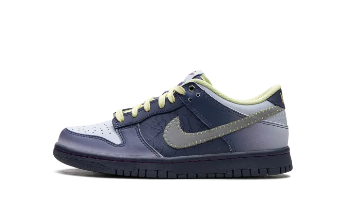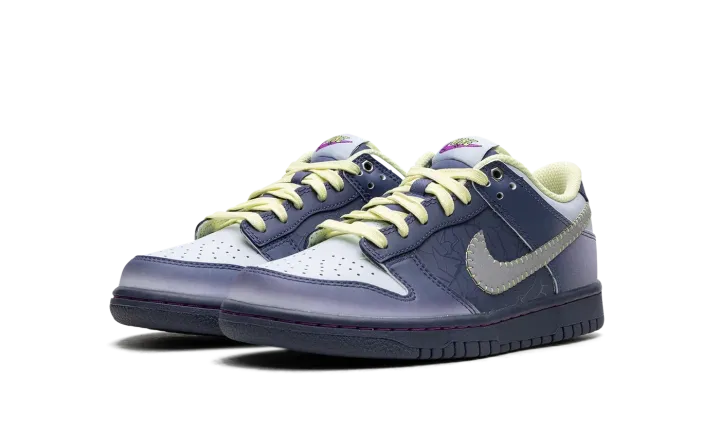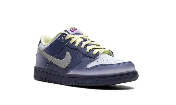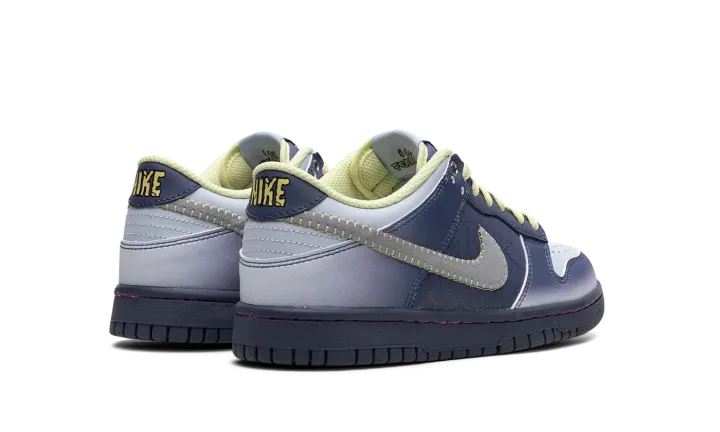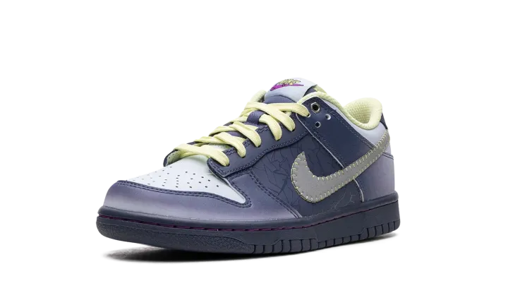 The Nike Dunk Low GS "Halloween" is the youth sizing of the retro basketball shoe in a colorway inspired by the spooky holiday. This Halloween-themed Dunk for 2023 features a white perforated leather toe with cracked grey leather on the mid-panel. Panels with grey gradients from light to dark add to the ghostly look. A grey leather Swoosh with thick yellow contrast stitching is seen on either side of the shoe. The phrase, "I AM FEARLESS!" is printed on the underside of the tongue. Release date: October 2023