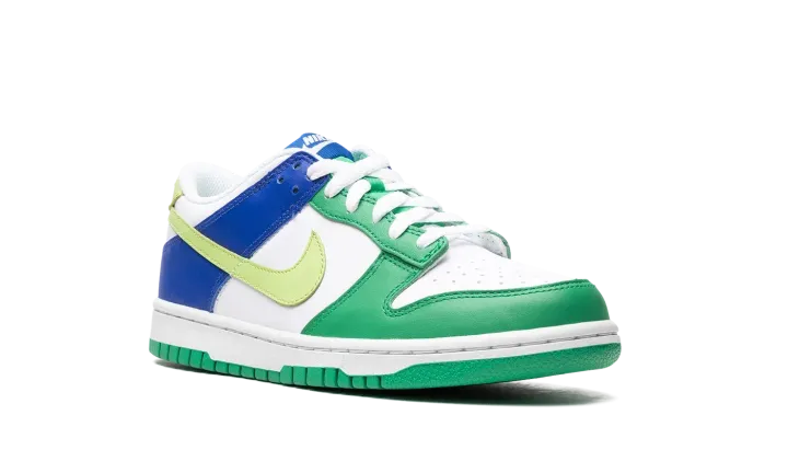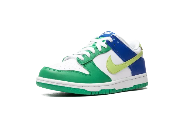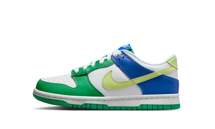 The Nike Dunk Low GS "Green/Blue" is the youth sizing of the classic basketball shoe in a colorway with unique green and blue color blocking. Released exclusively in kids sizing, the "Green/Blue" Dunk Low has a white leather base with Stadium Green leather overlays on the toe cap, forefoot, and eyelets. Game Royal leather panels are seen on the collar and heel. A Lemon Twist-colored leather Swoosh appears on the mid-panel. "Nike" branding is located on both the heel and tongue tag. Release date: August 1, 2023