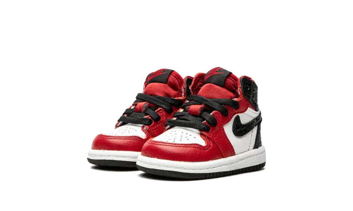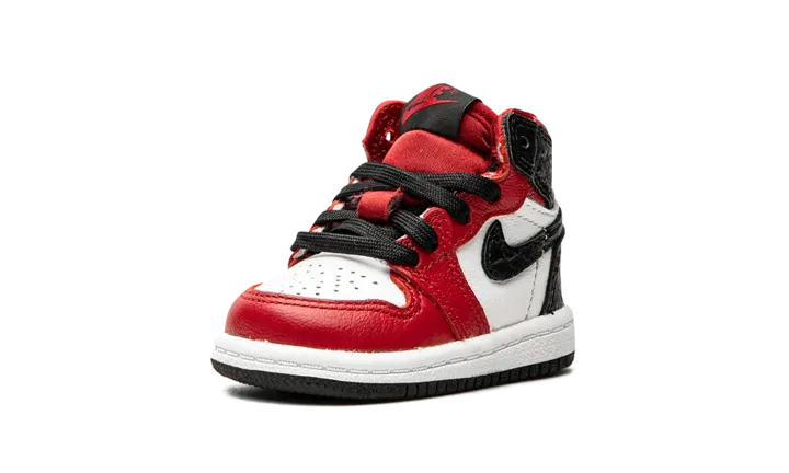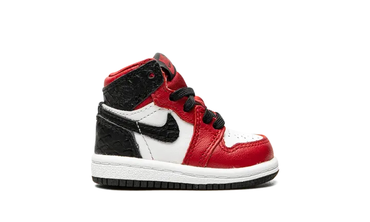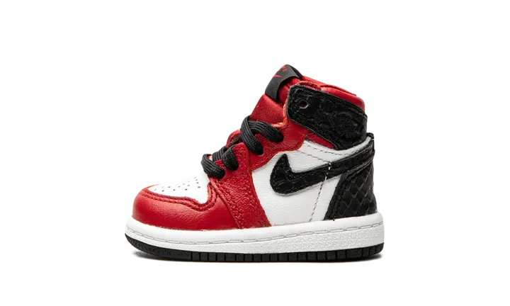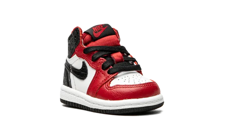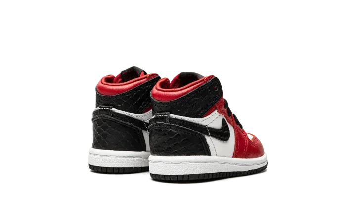 The Jordan 1 High TD "Satin Snake" is the toddler sizing of Michael Jordan's coveted signature shoe with a luxurious reptilian finish. Reminiscent of the "Chicago" colorway, this small Jordan 1 dubbed "Satin Snake" finds elevated materials like shiny red satin on the tongue and black snakeskin-textured leather on the heel panels and Swooshes. White leather dots the perforated toe and mid-panel. Tonal "Wings" branding resides on the collar. The red nylon tongue displays "Nike Air" branding atop a black nylon tongue tab. Finishing off the look of this toddler-sized Jordan 1 is a white midsole and black outsole. Release date: August 6, 2020.