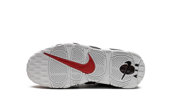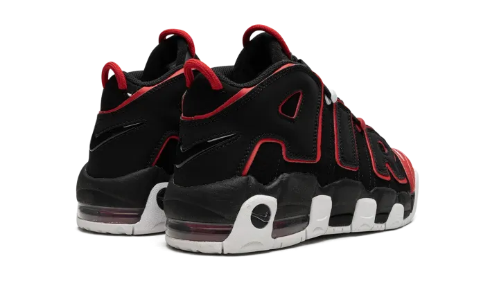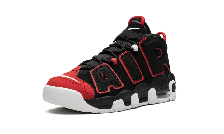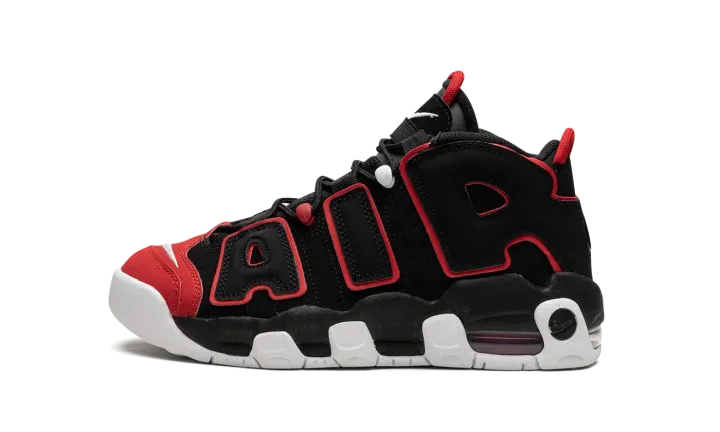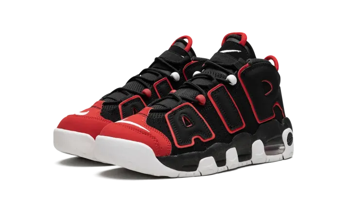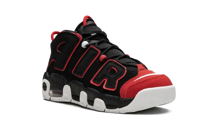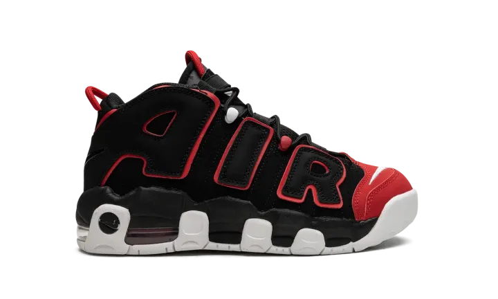 The Nike Air More Uptempo GS "Red Toe" is the youth sizing of the retro basketball shoe in a colorway loosely inspired by the Chicago Bulls. Dubbed the "Red Toe," this style of the Air More Uptempo features a black, white, and red color scheme that unofficially salutes the Bulls. The shoe features a University Red-colored leather toe cap paired with a black synthetic nubuck upper. Tonal "AIR" branding with red trim appears on the sides. An oversized white Swoosh is embroidered on the toe and a black jeweled Swoosh is found on the heel. Red-tinted visible Air bubbles in the midsole complete the look. Release date: September 28, 2022