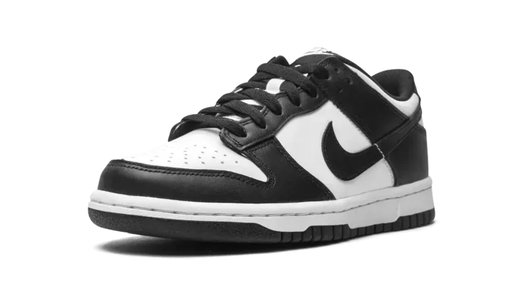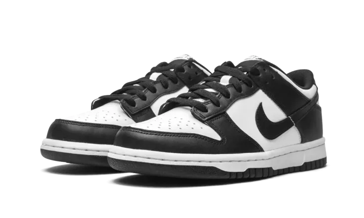 The Nike Dunk Low GS "Panda" is the youth sizing of the popular, two-tone, white-and-black colorway of the classic basketball shoe. The "Panda" Dunk is one of the most desirable sneakers in the marketplace due to its versatility and timeless design. The shoe features a white leather base contrasted black leather overlays and black leather Swoosh branding on the sides. White "Nike" branding is embroidered on the heel and printed on the tongue tag. A white midsole and black rubber outsole complete the look. Release date: March 10, 2021