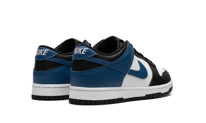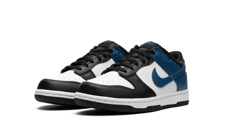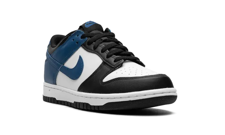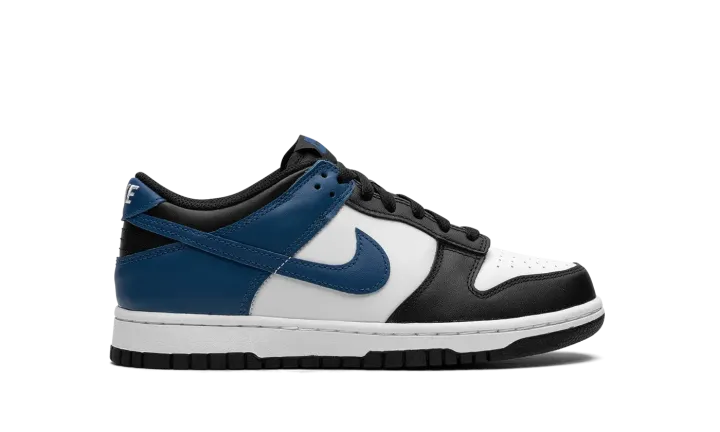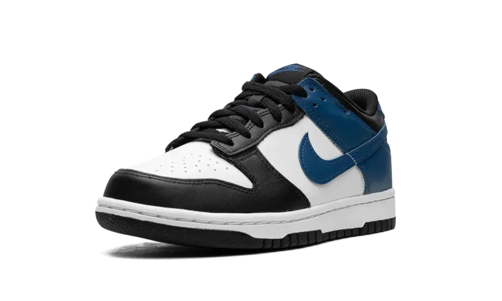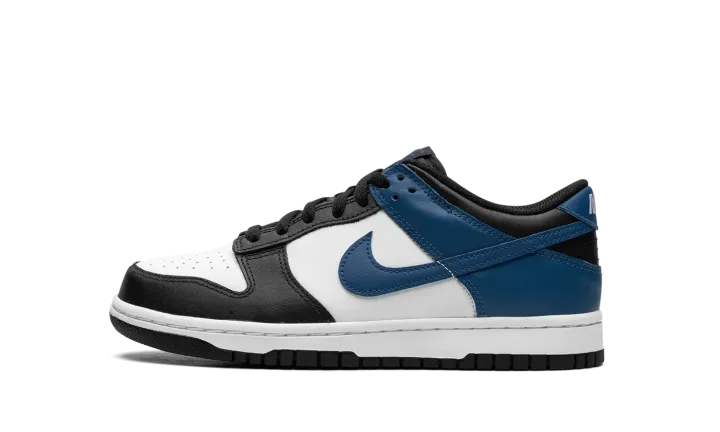 The Nike Dunk Low GS "Industrial Blue" is the youth sizing of the retro basketball sneaker featuring a white leather base with black and dark blue leather overlays. Classic "Nike" branding is embroidered on the heel and printed on the tongue tag. A white rubber midsole and black rubber outsole complete the look. Release date: June 23, 2023