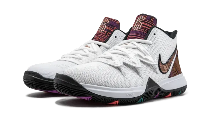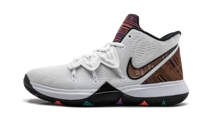 The Nike Kyrie 5 GS "Black History Month" is a kids basketball shoe that recognizes the cultural importance of African-Americans. The mesh base and lacing system are done in white and have commemorative accents. On the heel counter, Swoosh, and tongue, colorful patterns in brown, orange, purple, and black carry a look that is inspired by the theme of Afro-futurism. Finishing things off, the kids Nike Kyrie 5 "Black History Month" has a black outsole and teal, orange, and purple color blocking.