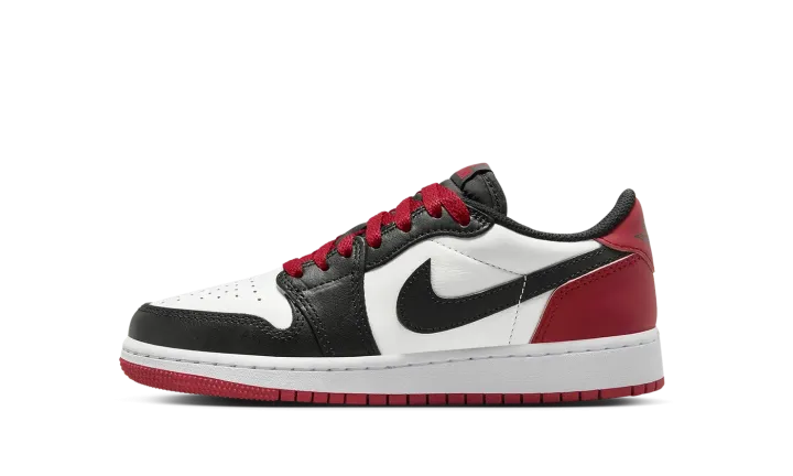 The Air Jordan 1 Low OG GS "Black Toe" is the youth sizing of the classic retro basketball shoe that shows love to one of the model's original styles. The "Black Toe" was an original colorway of the Air Jordan 1 High in 1985, and was worn by Michael Jordan with the Chicago Bulls during his rookie season in the NBA. The colorway is transferred onto the Jordan 1 Low OG here. The shoe features a white leather base with black leather overlays on the toe cap, forefoot, and eyelets. A black leather Swoosh logo appears on the sides. Varsity Red leather can be found on the heel, as can a black "Wings" logo on the heel tab. Classic "Nike" and Swoosh branding appear on the tongue tag. A white rubber midsole and black rubber outsole complete the look. Release date: July 28, 2023