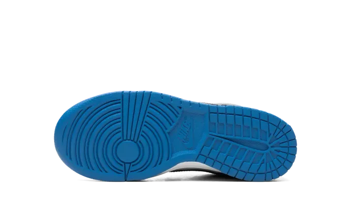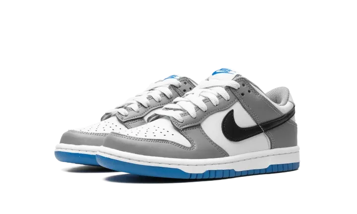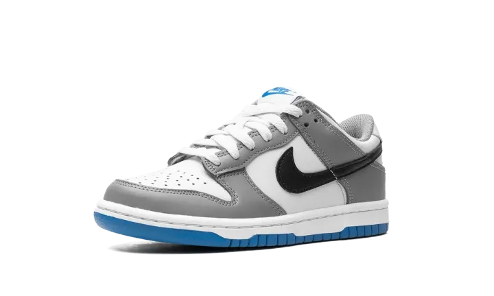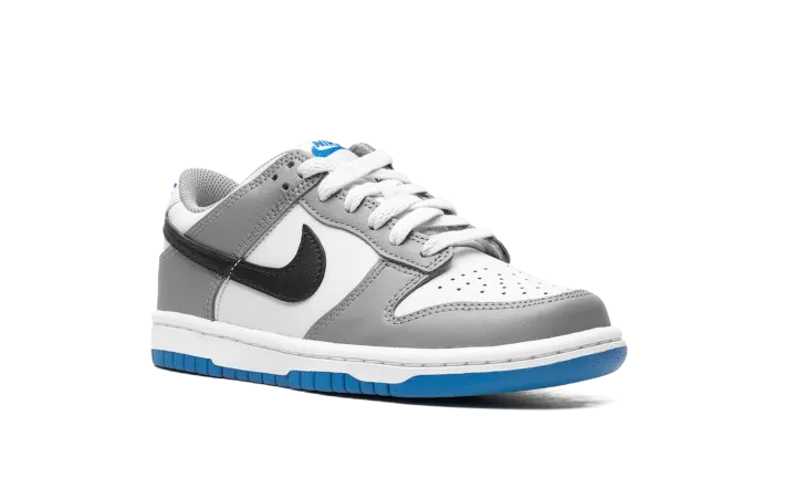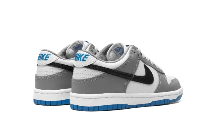 The Nike Dunk Low GS "Grey/Blue" is the youth sizing of the retro basketball shoe with a timeless color scheme. The shoe's upper features a white leather base with grey leather overlay panels. A black leather Swoosh logo appears on the mid-panel while "Nike" branding is embroidered on the heel and printed on the tongue tag. A white midsole and grey outsole put the finishing touches on the colorway. Release date: September 15, 2023