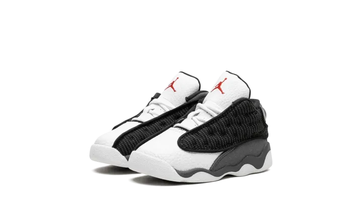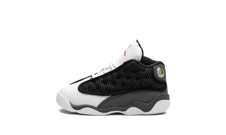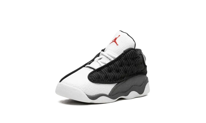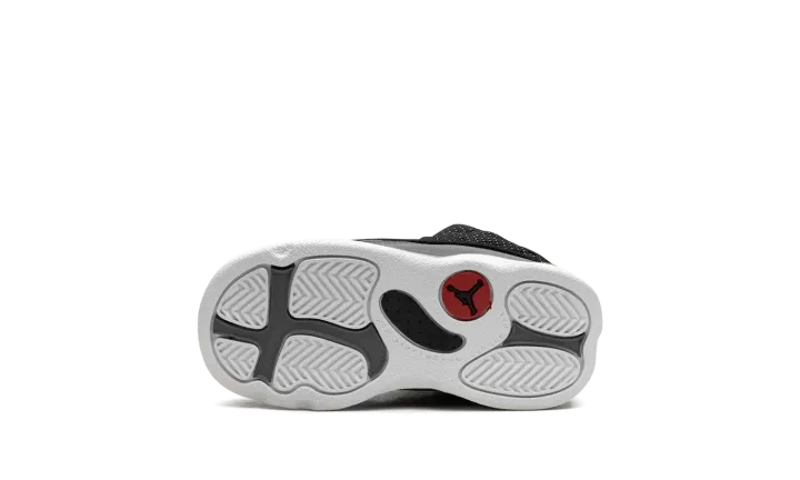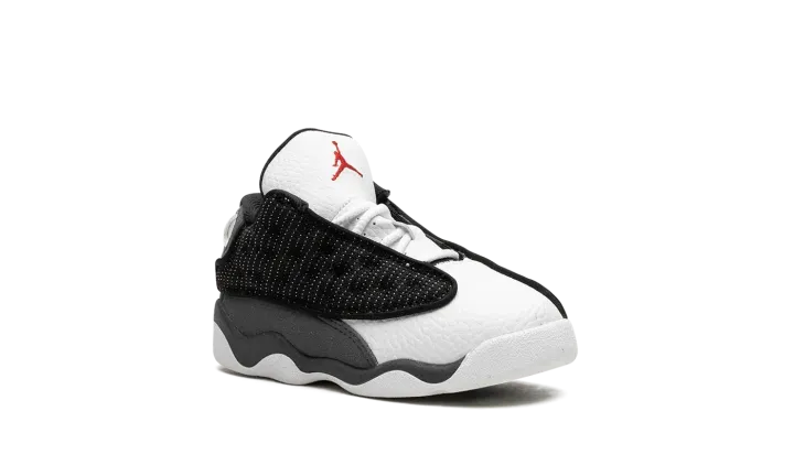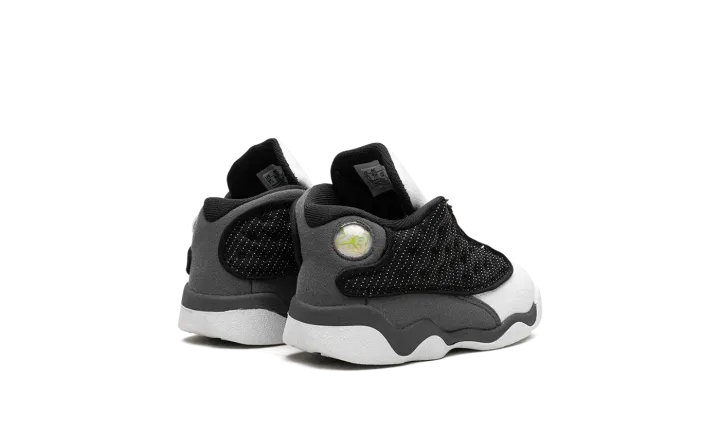 The Air Jordan 13 TD "Black Flint" is the toddler sizing for the colorway of the retro basketball shoe that is loosely inspired by one of the model's original releases. The shoe in question is the Jordan 13 "Flint," which debuted in 1998 and is one of the most popular colorways of Michael Jordan's thirteenth signature shoe. Here, the shoe features the same color block as its predecessor, but with black replacing blue. The design is complete with a black mesh upper that's contrasted with grey suede overlays and a white leather toe. A holographic jewel appears on the lateral side of the collar. Release date: April 22, 2023