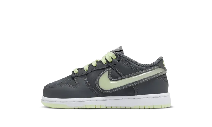 Made for little kids, the Nike Dunk Low PS 'Halloween - Glow In The Dark' celebrates spooky season with a grey upper, featuring a nubuck base with smooth leather overlays. Glow-in-the-dark accents include the laces, raised TPU Swoosh, and the Nike wordmark that embellishes the back tab.