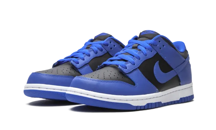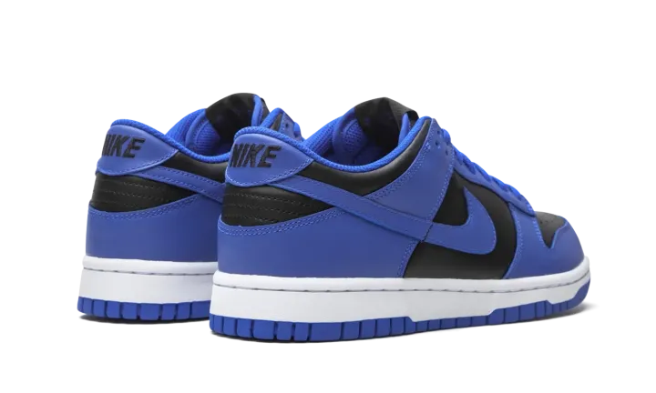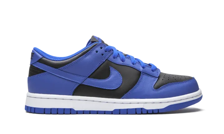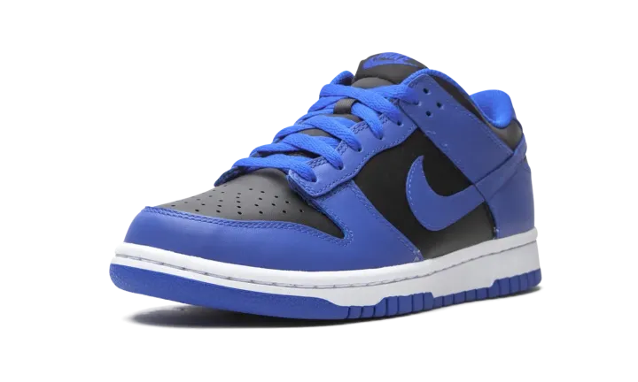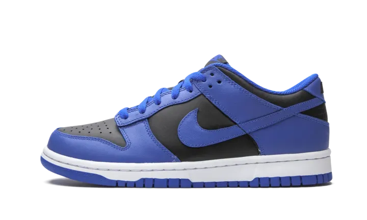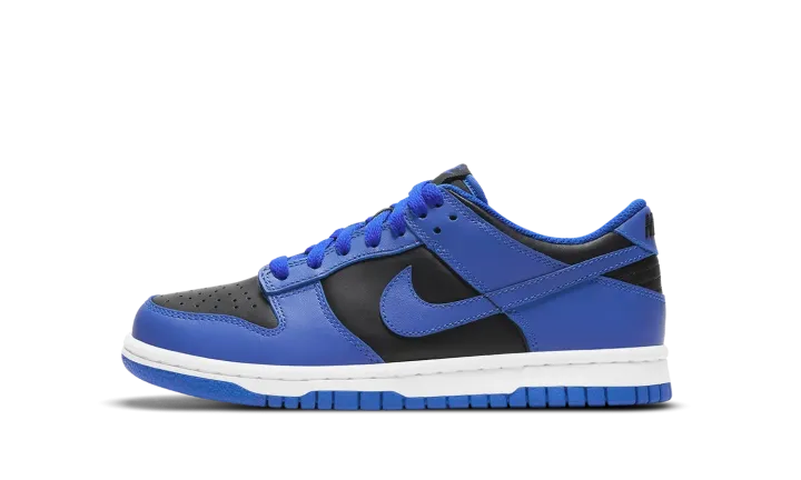 The Nike Dunk Low GS "Hyper Cobalt" is an attention grabbing colorway of the iconic silhouette that was originally marketed as the premier basketball shoe of college basketball. The Dunk has since transcended its roots as the go-to sneaker for basketball's brightest young stars in the '80s to become perhaps something even greater: a lifestyle shoe that can be worn by all walks of life. The "Hyper Cobalt" colorway features black leather on the perforated toe and on the mid-panel, collar, and heel with Hyper Cobalt leather overlays that are a striking contrast to the neutral base. The same regal shade of blue appears on the Swoosh branding on either side of the shoe and on the liner and shoelaces. On the heel, black "Nike" embroidery adds a retro touch. Release date: February 18, 2021.