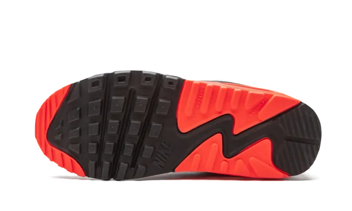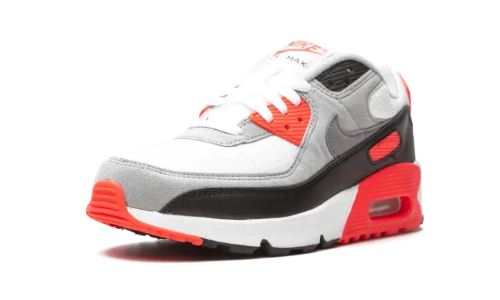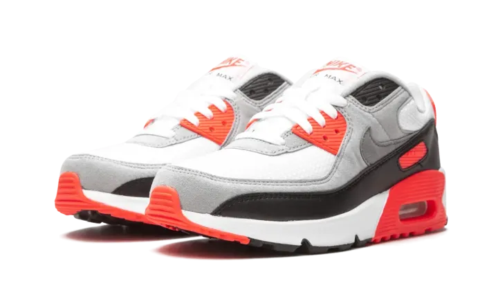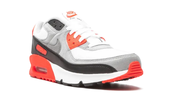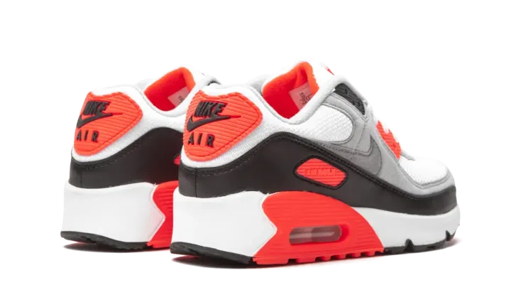 The Nike Air Max 90 GS "Infrared 2020" is the youth sizing of the all-time classic colorway of the retro runner. Nike celebrated the Air Max 90's 30th anniversary in 2020 by releasing this legendary "Infrared" colorway of the model. This Fall 2020 version of the low-top performance shoe features the original shape and materials used on the first batch of colorways from 1990. The upper displays a mixture of materials and colors arranged in true-to-original fashion. White mesh is located on the toe and collar. The mid-panel, toe, and collar display a contrasting grey felt overlay that breaks up the appearance. Other details include a slightly darker shade of grey on the Swoosh on the mid-panel and "Infrared" accenting on the eyelets, Air Max branding window, heel tab, and panel that surrounds the clear Air unit in the heel. A black leather mudguard finishes off the look. Release date: November 9, 2020.