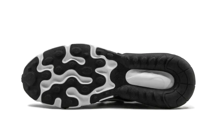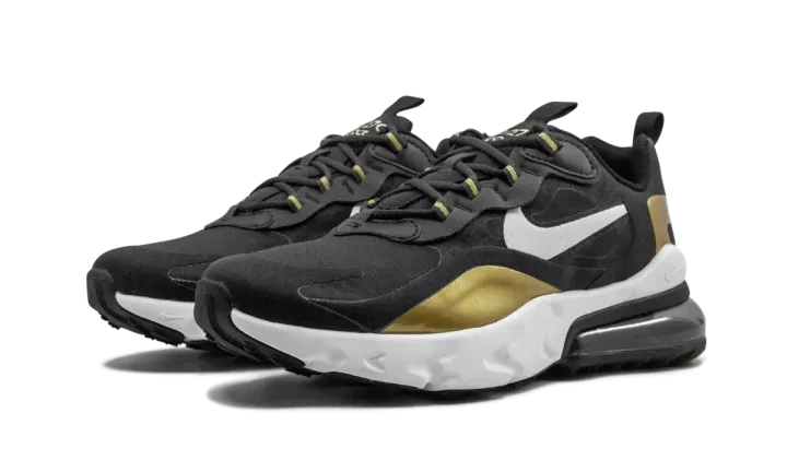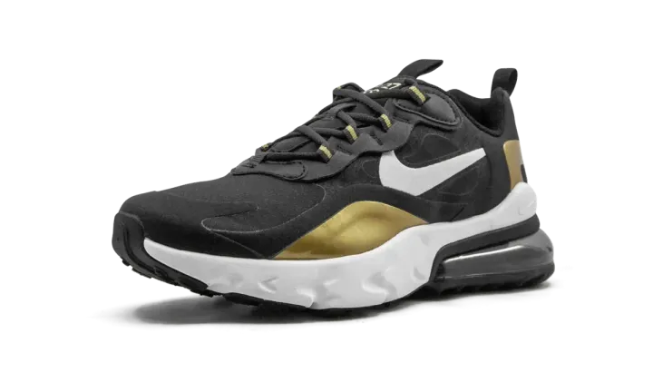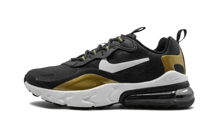This "Anthracite/White-Black" grade school only colorway of the Nike Air Max 270 React offers unmatched comfort with bold style. Combining two of Nike's most revolutionary technologies, a translucent black Air Max unit at the back of the shoe gives way to white React cushioning up front, minimizing heel impact while cushioning the forefoot with every step. The layered black fabric upper features gold overlays on the forefoot and heel, as well as gold-striped lace loops. Gold "Air 270 React" lettering adorns the tongue, and a white Swoosh pops on the side of the shoe.