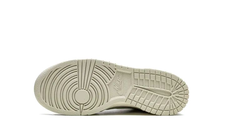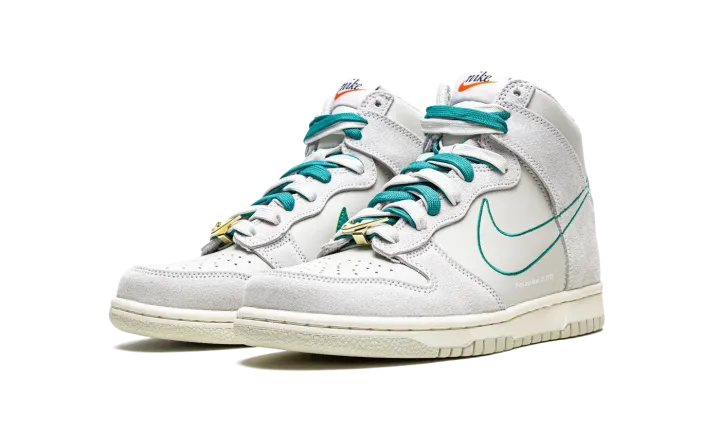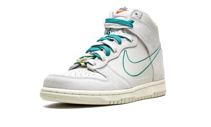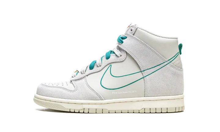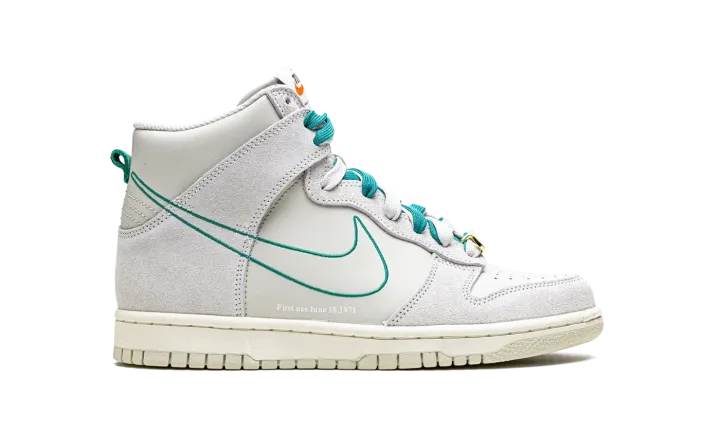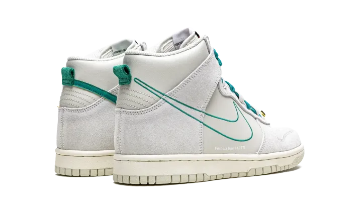 The Nike Dunk High SE GS "First Use - Green Noise" is the kids sizing of the vintage basketball shoe in a colorway that shows appreciation for Nike's iconic Swoosh logo. From the "First Use" collection, the "Green Noise" edition is complete with various overtures to Nike's Swoosh logo. Instances alluding to the Swoosh and its origins include the phrase "First use - June 18, 1971" on the lateral side, and old school "Nike" and Swoosh branding on the tongue. The upper is arranged in suede and leather in Light Bone on the overlays and base, respectively. A Green Noise outline Swoosh can be found on the lateral sides. Additional green accenting comes into play on the set of laces layered over a set of white laces on the tongue. A metallic gold Swoosh lace dubrae is found on the vamp. Release date: August 10, 2021