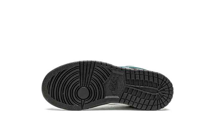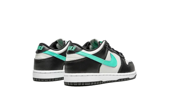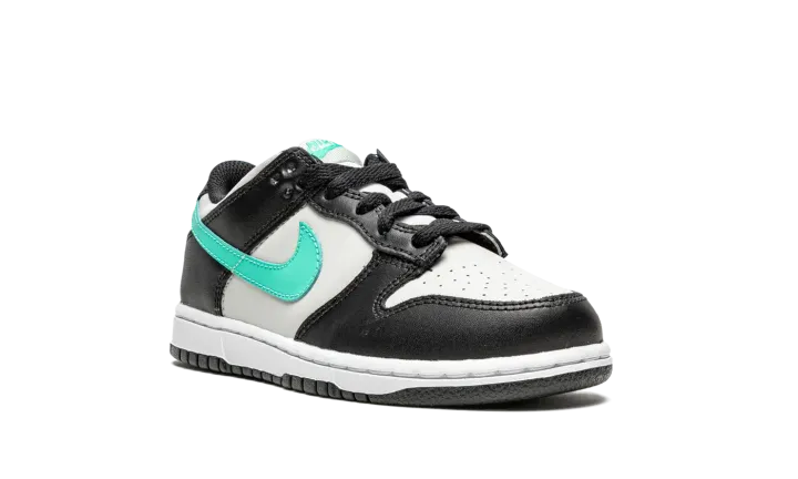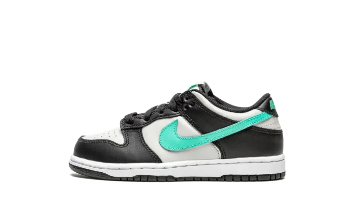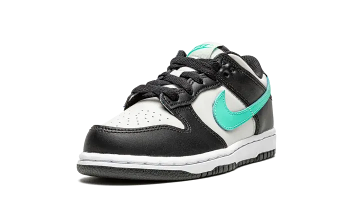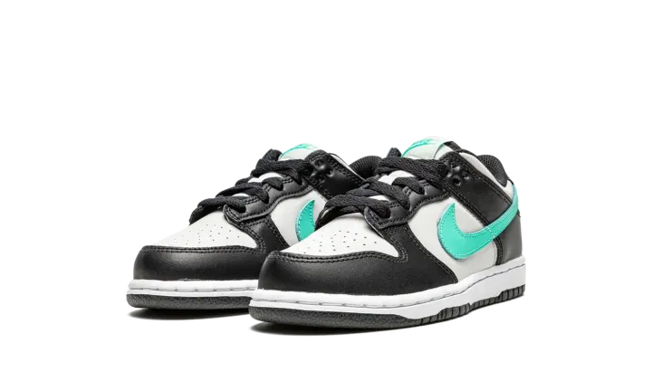 The Nike Dunk Low PS "Tropical Twist" is the preschool sizing of the kids-exclusive colorway of the low-top, retro basketball and lifestyle that pays homage to one of the greatest Dunks of all time. With its teal, black, and white color block, the "Tropical Twist" undoubtedly references the color block of the Diamond Supply Co. x Nike SB Dunk Low "Tiffany," a highly desirable colorway imagined by the skate brand and Nike SB in 2005. Although not a direct one-to-one remake of the "Tiffany," the "Tropical Twist" channels the former's spirit with its turquoise leather Swoosh and black leather overlays. Light Bone leather appears on the perforated toe, mid-panel, and heel. Teal "Nike" detailing graces the heel and is printed on the white nylon tongue tag on top of the Light Bone-colored nylon tongue. Release date: June 10, 2021