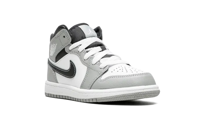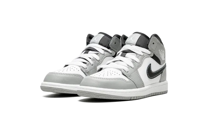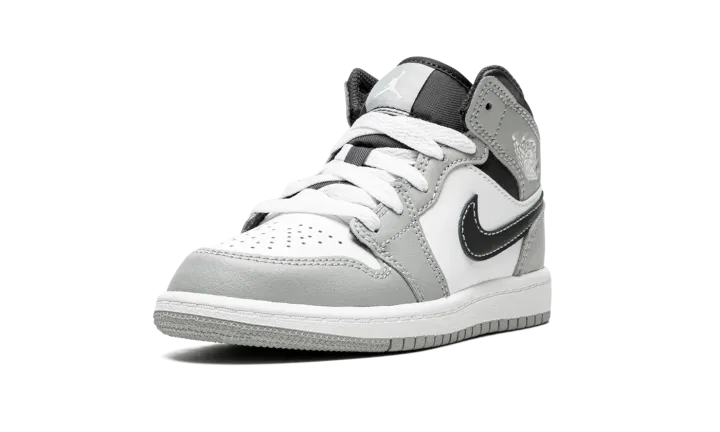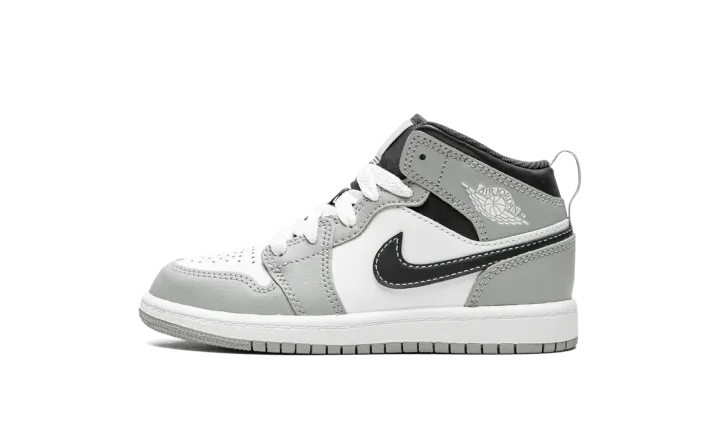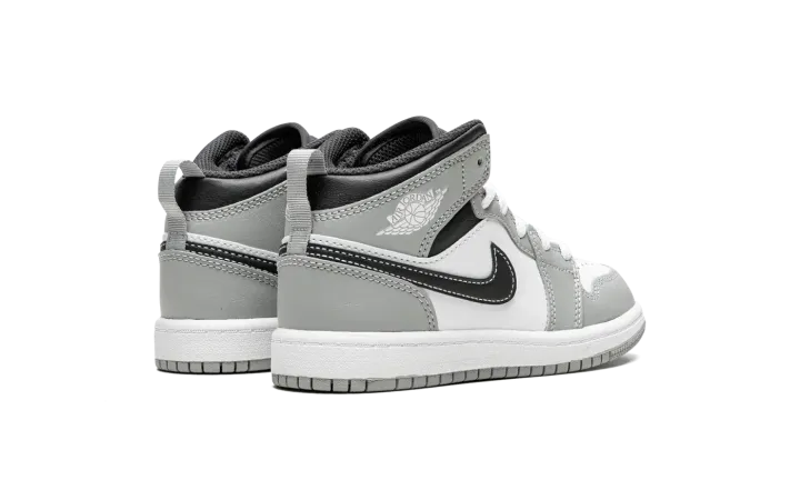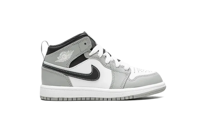 The Air Jordan 1 Mid PS "Light Smoke Grey" is the preschool sizing of the casual lifestyle shoe in a versatile colorway. The Jordan 1 Mid is one of Jordan Brand's most popular shoes. It's beloved by sneaker collectors of all ages for its timeless looks and comfort, and it's easy to see why on this "Light Smoke Grey" colorway. The shoe's base is designed in white leather, while contrasting Light Smoke Grey leather appears on the overlay panels. A black leather Swoosh with white contrast stitching is located on the mid-panel. The black nylon pull tab on the heel assists with on/off wearability.