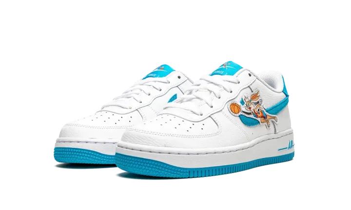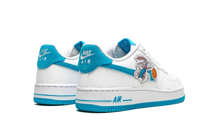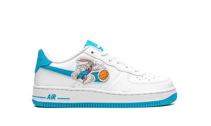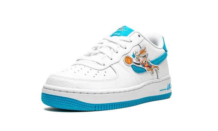 The Space Jam x Nike Air Force 1 Low GS "Hare" is a special-edition kids shoe that's part of the larger Nike x Space Jam: A New Legacy collection, created to celebrate the 2021 movie where LeBron James and the Looney Tunes team up in a spectacularly imaginative cartoon universe. Made in kids sizing, this colorway utilizes a white leather upper with blue accents and suede Nike Swoosh. Bugs Bunny and Lola Bunny are embroidered onto each tongue label, and the same characters appear as patches affixed to the Nike Swoosh on each lateral side.