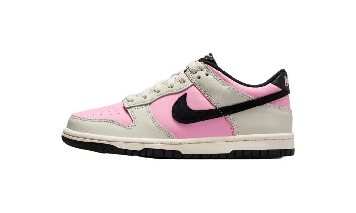 The Nike Dunk Low GS 'Pink Rise Light Orewood Brown' rocks a vibrant pink leather upper with light tan forefoot and heel overlays. A black Swoosh matches the Nike-branded tongue tag, collar lining and back tab. The off-white foam midsole maintains the aged aesthetic, anchored by a classic, black rubber outsole.