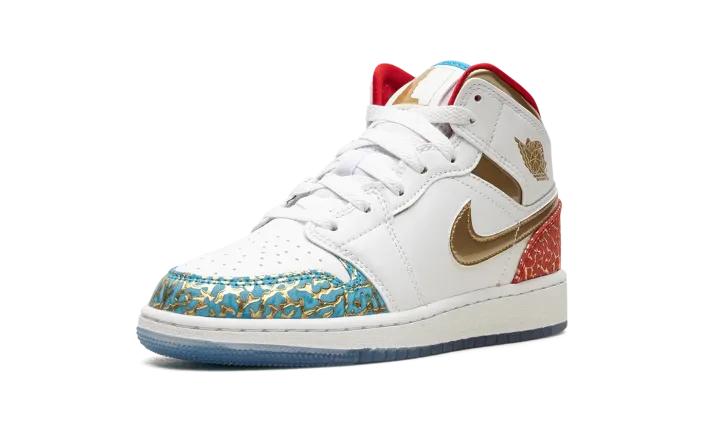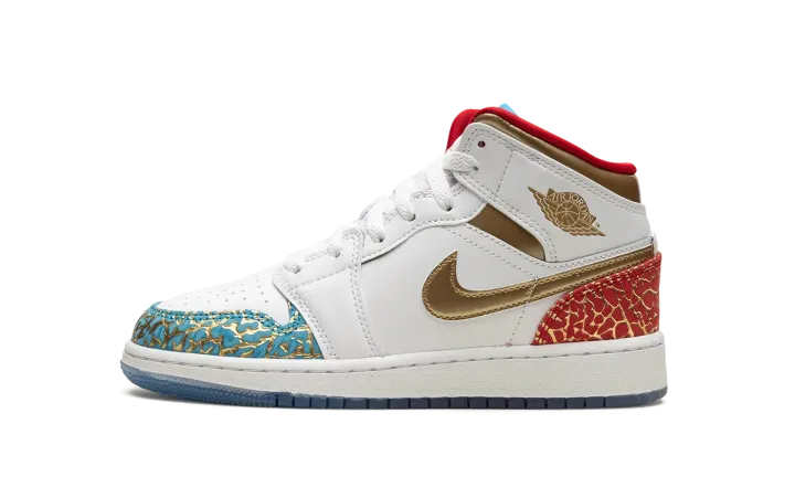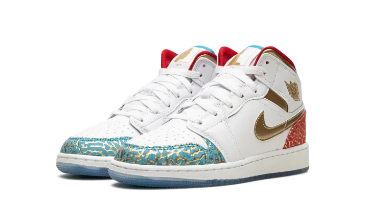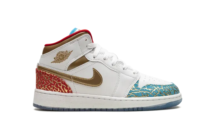 The Air Jordan 1 Mid GS "UNC to CHI" is the youth sizing of the colorway that shows love to Michael Jordan's college and professional basketball careers. The "UNC to CHI" theme debuted on the Air Jordan 1 High OG before it appeared on other Air Jordan models, including this Jordan 1 Mid. For this interpretation of the "UNC to Chicago" theme, Jordan Brand gives the colorway elephant print overlays inspired by the patterning seen on the Air Jordan 3. Blue Lightning-colored elephant print inspired by the North Carolina Tar Heels, Jordan's alma mater, appears on the toe while University Red elephant print inspired by the Chicago Bulls, Jordan's NBA team, is seen on the heel. White leather is found on the base. A Metallic Gold leather Swoosh and "Wings" logo give the shoe a championship-inspired look. Release date: June 24, 2023
